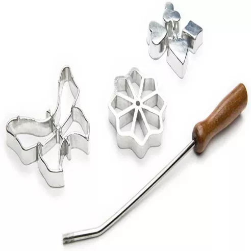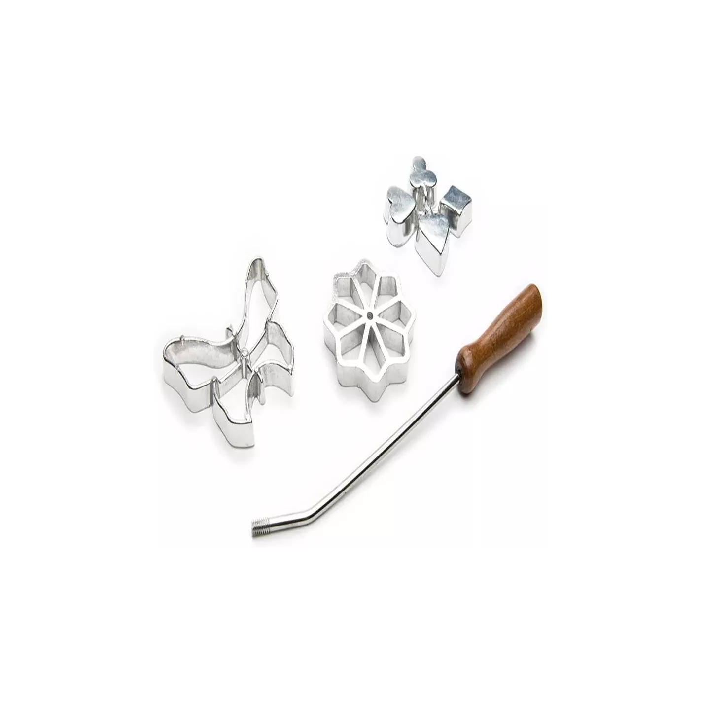 Nuestro juego de rosetas de cuatro piezas es ideal para empezar, ya que incluye las necesidades de este proceso de preparación especial. Utilice las tres planchas detalladas para dar forma a las galletas en forma de mariposas, flores y naipes, y utilice la práctica herramienta de elevación para quitar las planchas del aceite caliente de forma segura.