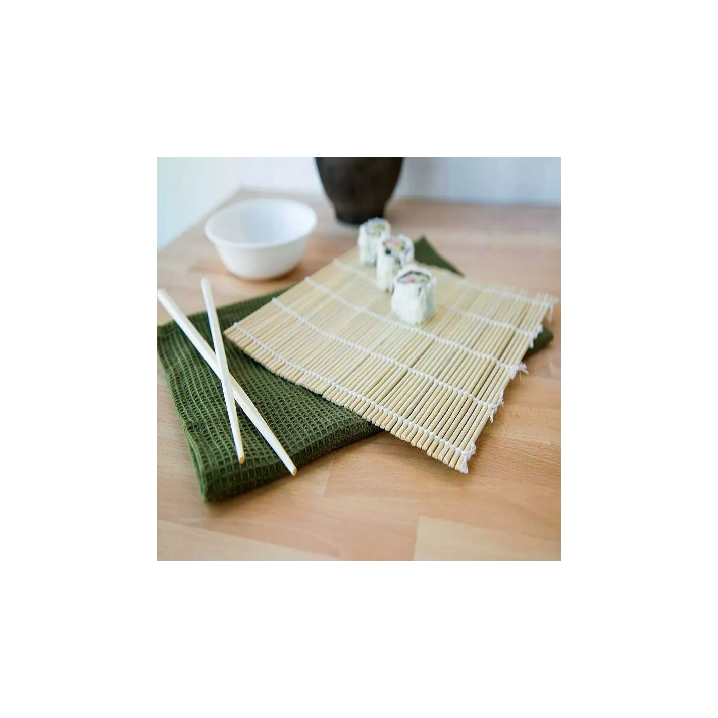 En el mundo del sushi, la presentación es importante. Cree fácilmente rollos de sushi agradables y uniformes en su propia cocina con esta estera de sushi Fox Run. Hecho de bambú 100% natural tejido con hilo, este tapete es justo lo que necesitas para hacer tus variedades de sushi favoritas en casa. Perfecto para los amantes del sushi desde hace mucho tiempo y para cualquiera que esté aprendiendo a hacer sushi, este tapete cuadrado de 9 pulgadas ayudará a perfeccionar la popular forma de arte culinario japonés. Transforma el arroz, el nori, el pescado y las verduras en una deliciosa obra maestra