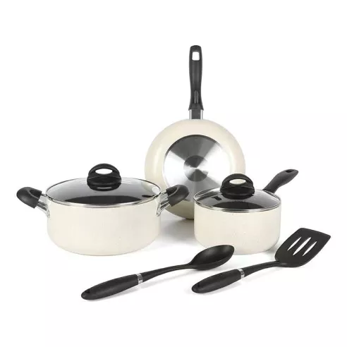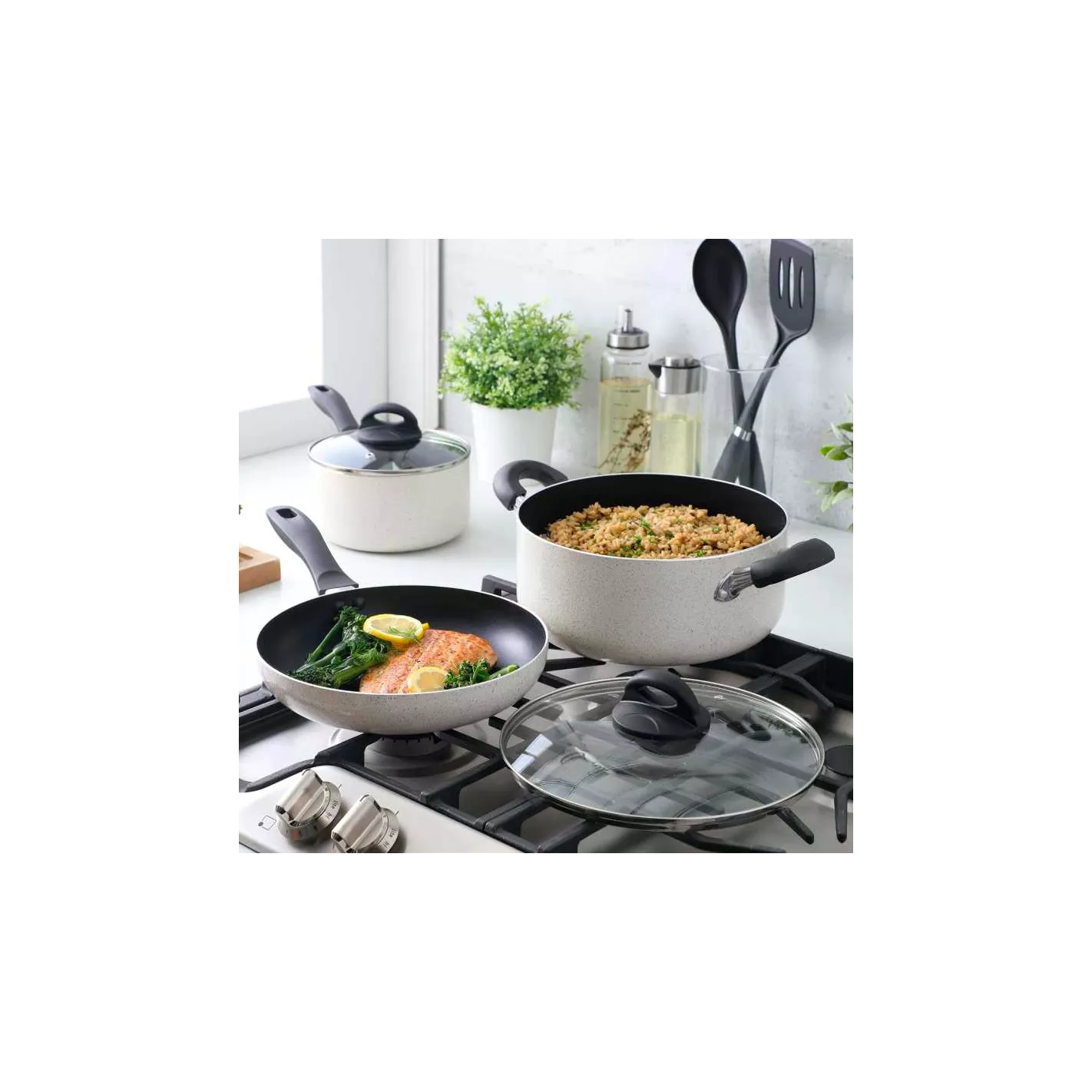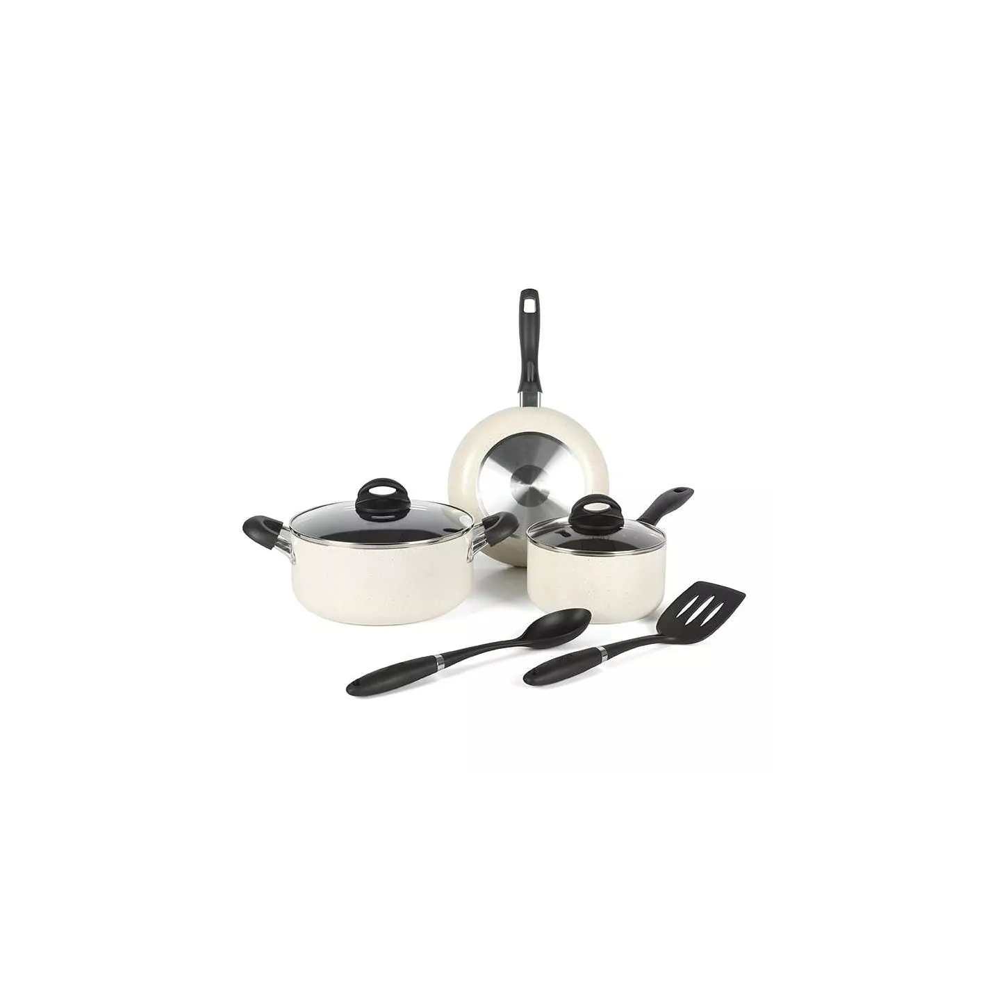 Cada olla y sartén cuentan con una construcción de aluminio duradera para distribuir el calor y cocinar de manera uniforme sin puntos calientes. Este juego completo de utensilios de cocina viene con dos utensilios de cocina livianos de nylon con cabezales antiadherentes para evitar rayones y raspaduras y mangos ergonómicos para un agarre ergonómico.