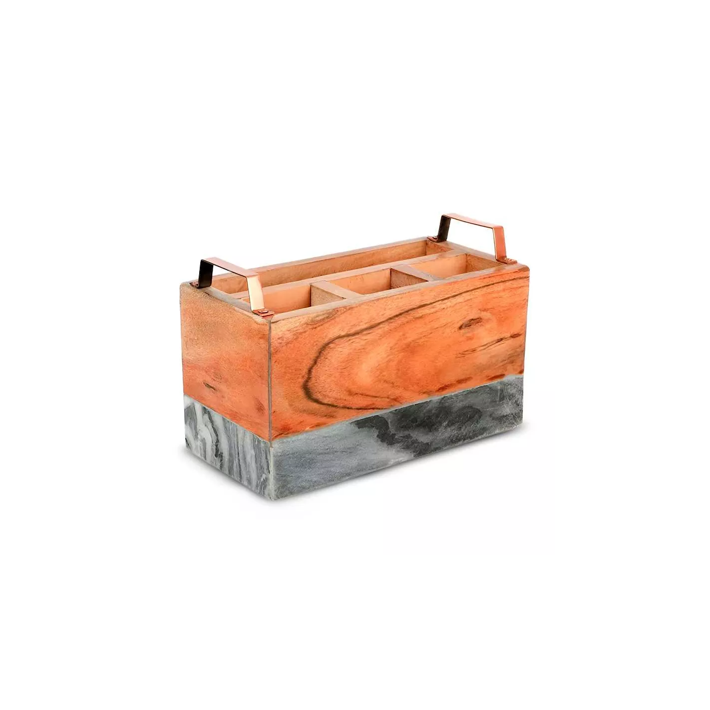 Guarde utensilios y otros elementos esenciales con estilo con este organizador para utensilios, hecho de materiales de madera de mango y mármol con adornos de latón, esta llamativa combinación realza cualquier ocasión.