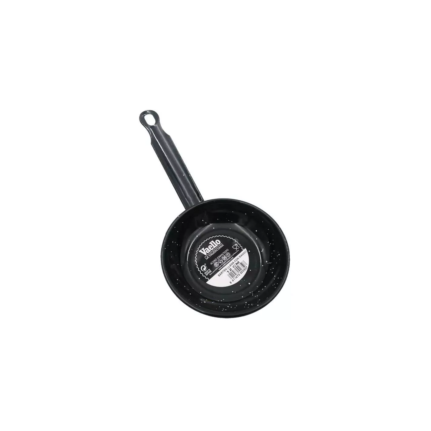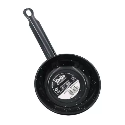 Paellera de acero esmaltado Mini-paellera de 12 cm. Esta paellera tradicional española está ideal para servir una pequeña tapita de paella. También para uso decorativo.