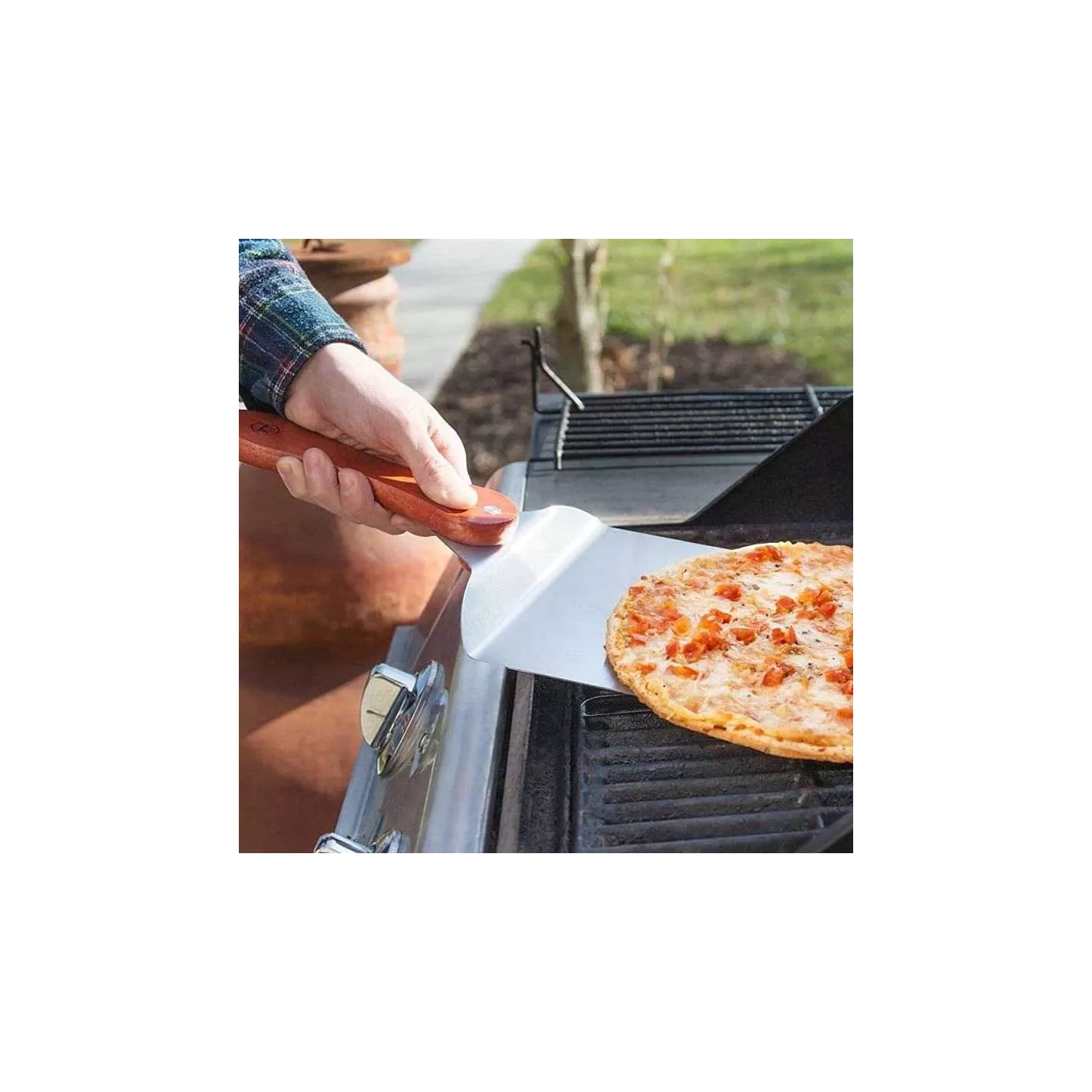 La pala evita derrames y quemaduras, manteniendo la noche de pizza siempre tan divertida. Con su mango fino que se pliega para su almacenamiento, y superficie lisa de acero inoxidable, la pala de pizza ofrece una forma segura y cómoda de quitar la pizza de su horno o parrilla. También hace y excelente cáscara de pan para panes caseros o de panadería. Ya sea que estés dentro o fuera, transferir y cortar pizza nunca ha sido tan fácil.