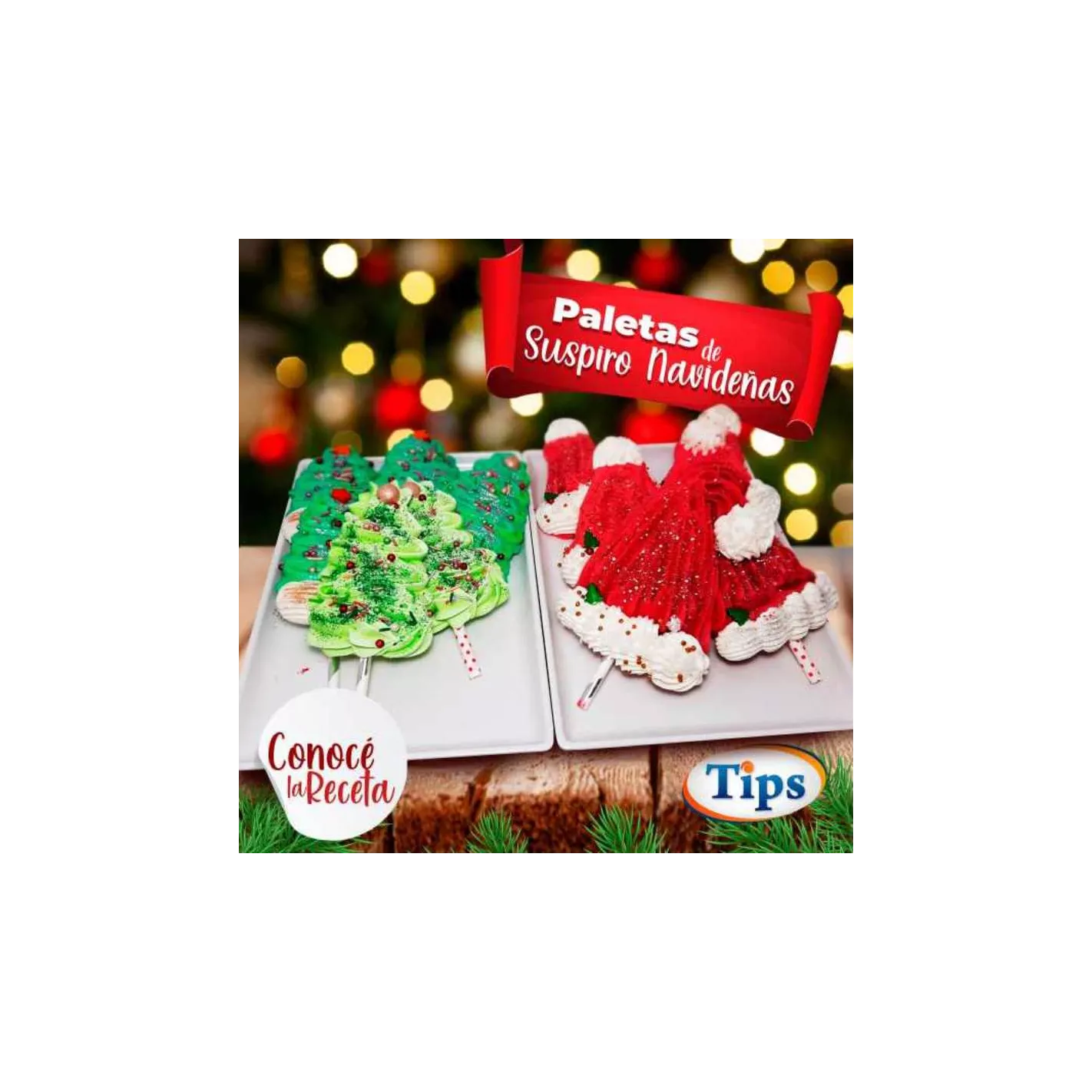 3-Colocamos en una manga con la boquilla deseada y sobre una bandeja con papel parchment o tapete de silicón formamos arbolitos y gorritos de santa como se muestra en el vídeo y se decoran con confitillo, diamantinas, escarchas, etc.