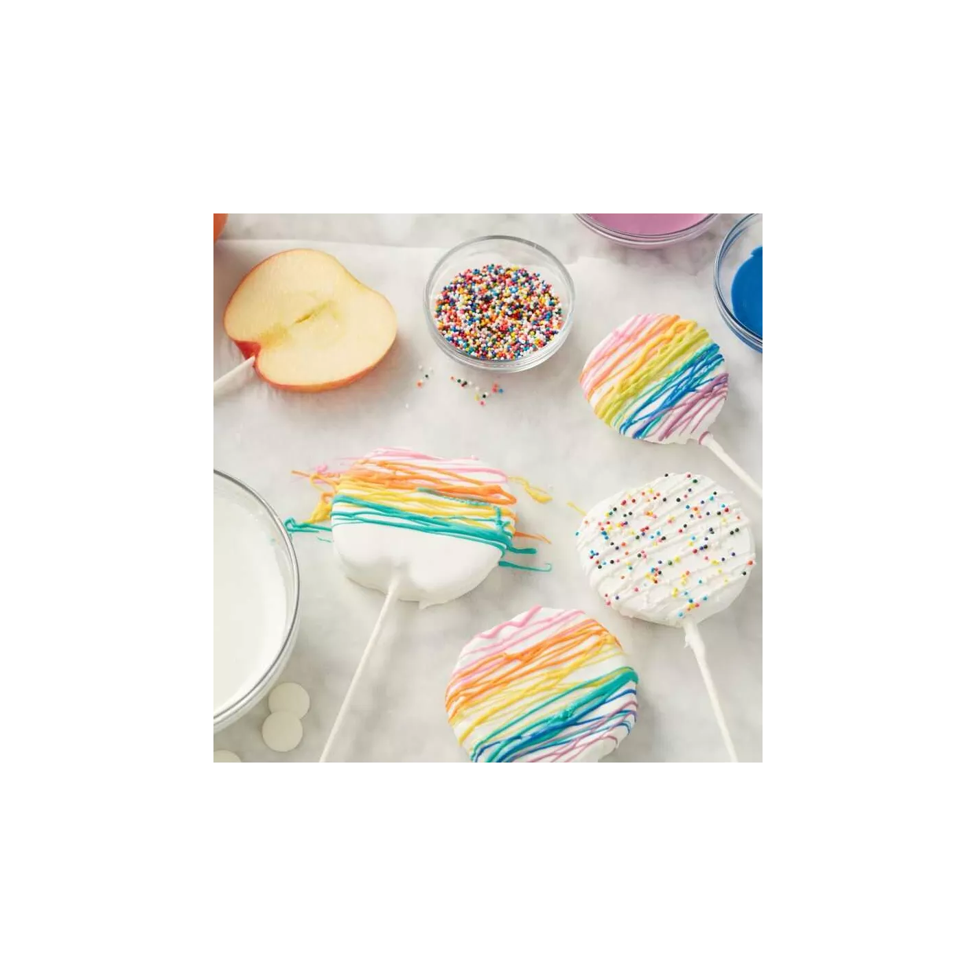 Los palillos decoradores son perfectos para todos tus pops. Crea emocionantes galletas y pasteles para la fiesta ideal. Para las golosinas clásicas, use moldes de paleta en formas emocionantes y chocolates derretidos fáciles de fundir para un arco iris de colores. No apto para horno.