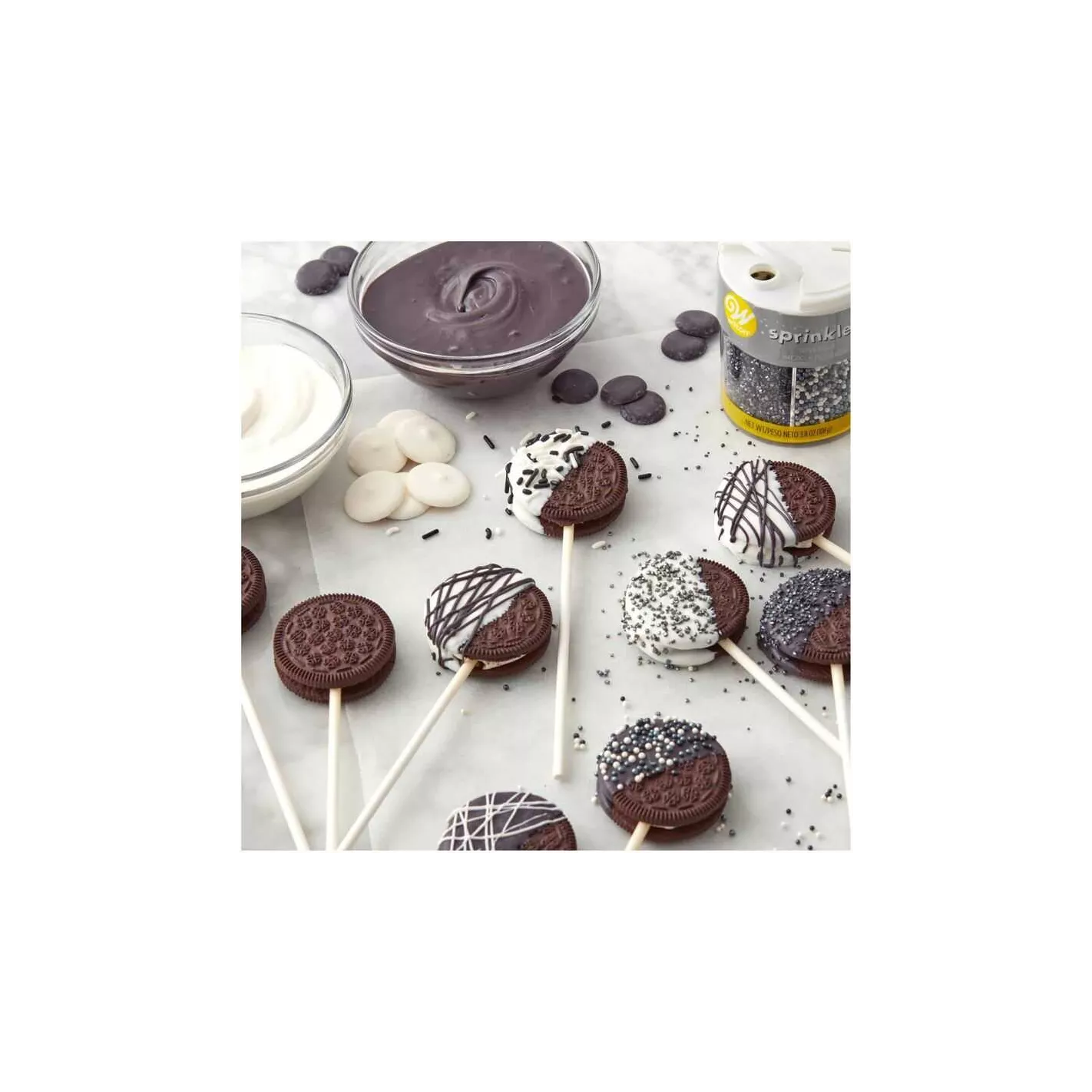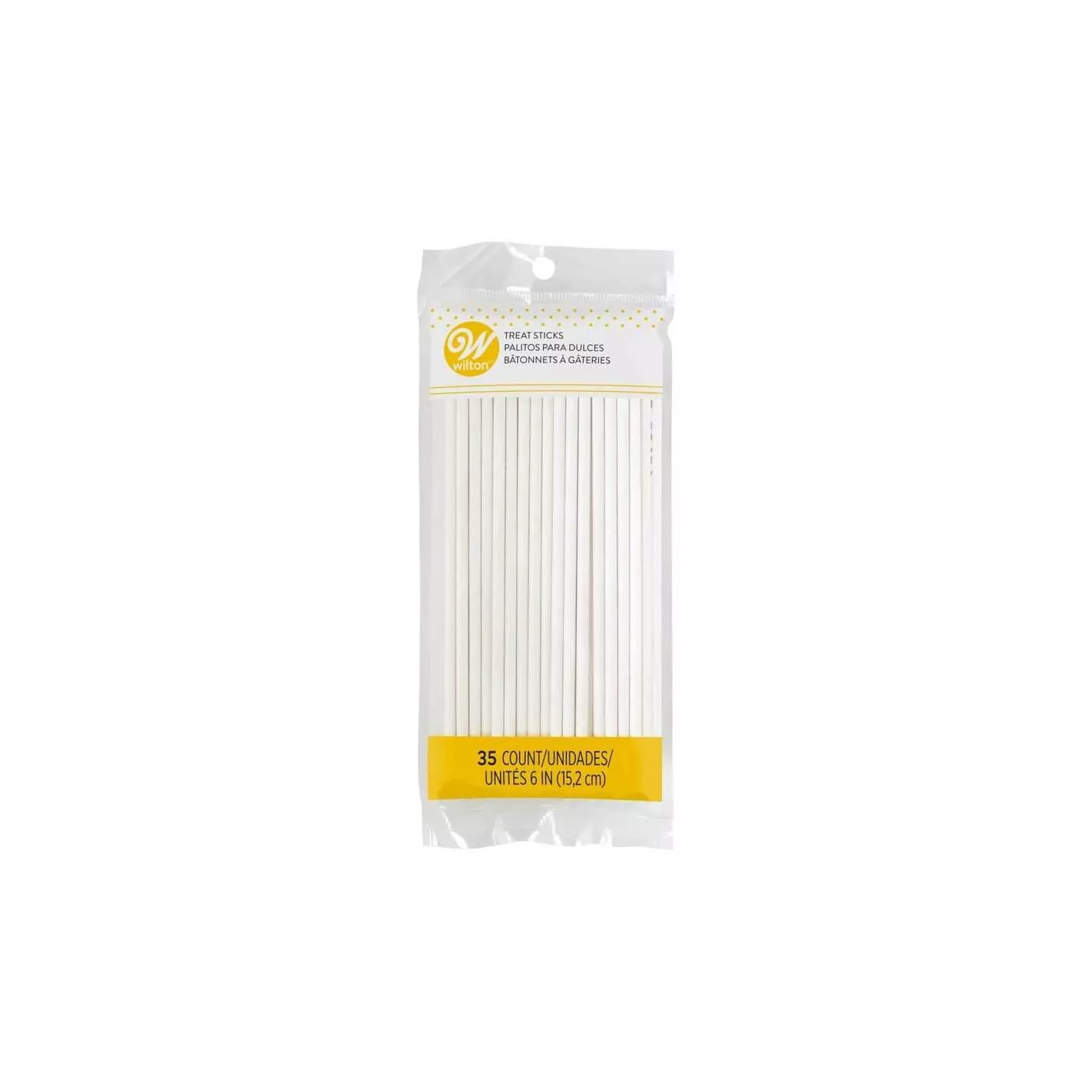 Tenga a mano estos palos de piruletas de papel para sacar cuando quiera hacer pasteles para los niños, o paletas de chocolate hechas con moldes Wilton y Candy Melts. Incluye 35 palillos de 6 pulgadas color blanco. No apto para el horno.