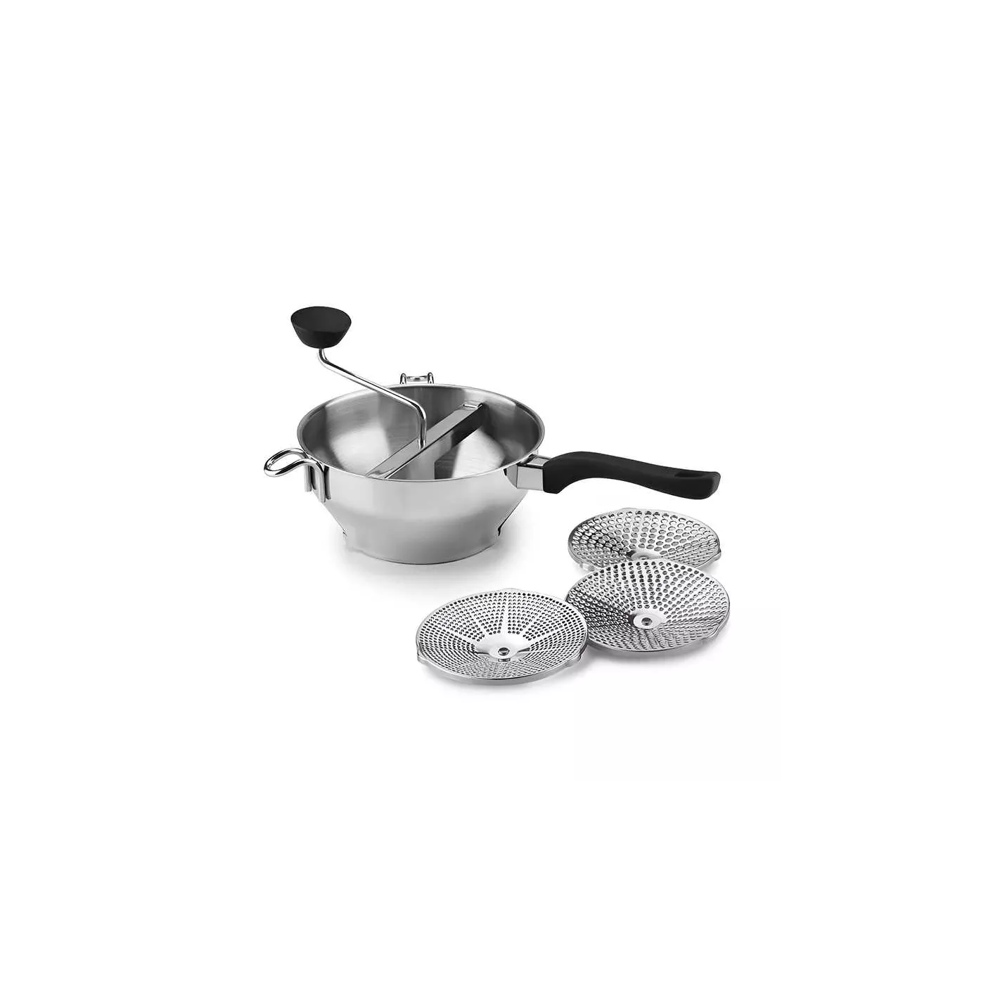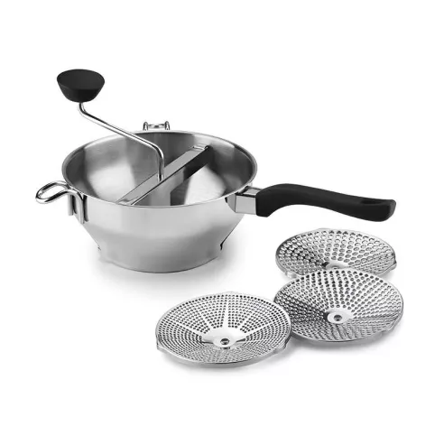 Equipado con discos de corte finos, medianos y gruesos para preparar una amplia variedad de alimentos. El disco fino se puede utilizar para puré de guisantes, zanahorias, calabazas y más para la comida del bebé, mientras que el disco mediano es ideal para ñoquis caseros, y el disco grueso hace que el trabajo rápido de puré de papas gruesas y puré de manzana. El molino de alimentos está diseñado ergonómicamente para un giro suave, está equipado con una perilla giratoria de agarre suave y asas, y es completamente apto para lavavajillas.