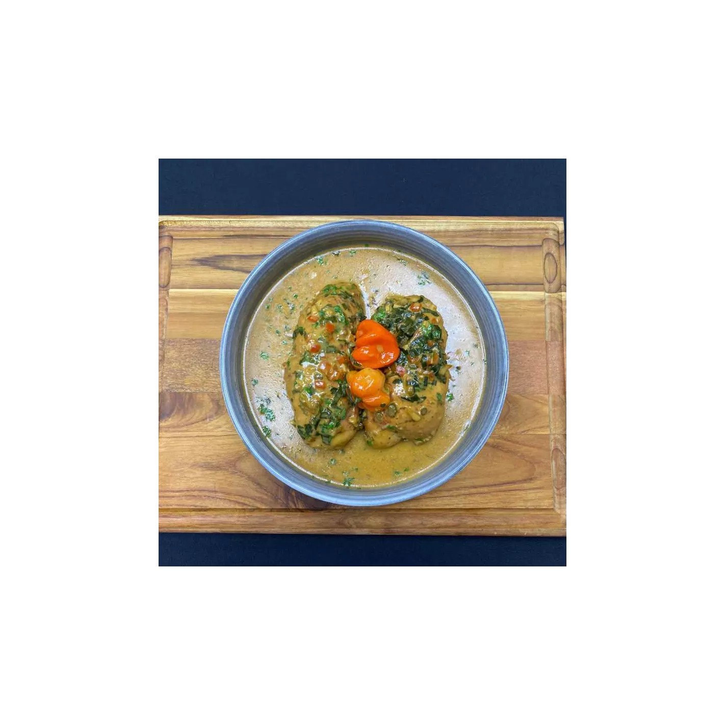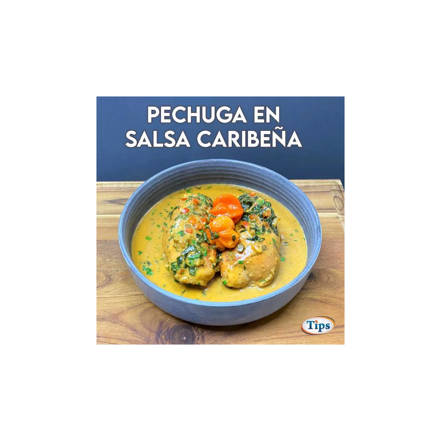 8.Servimos caliente y bañamos el pollo con la salsita caribeña.