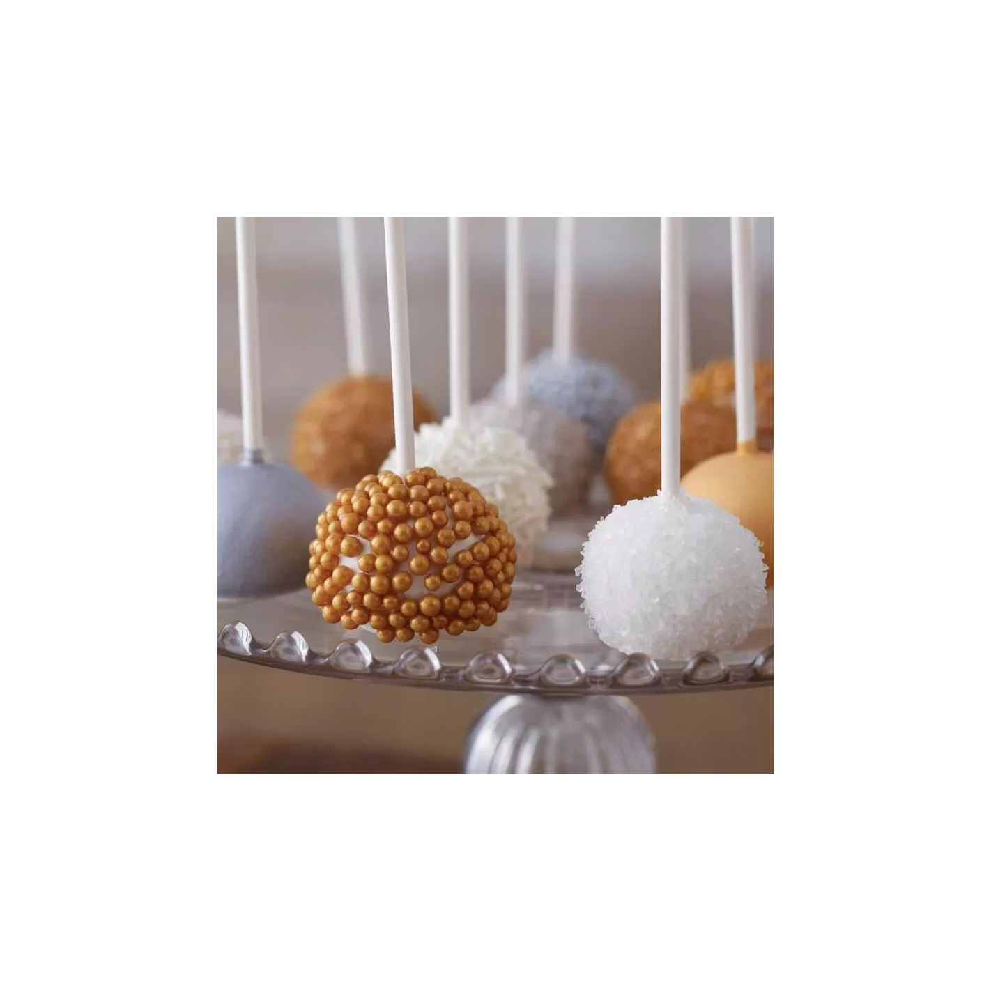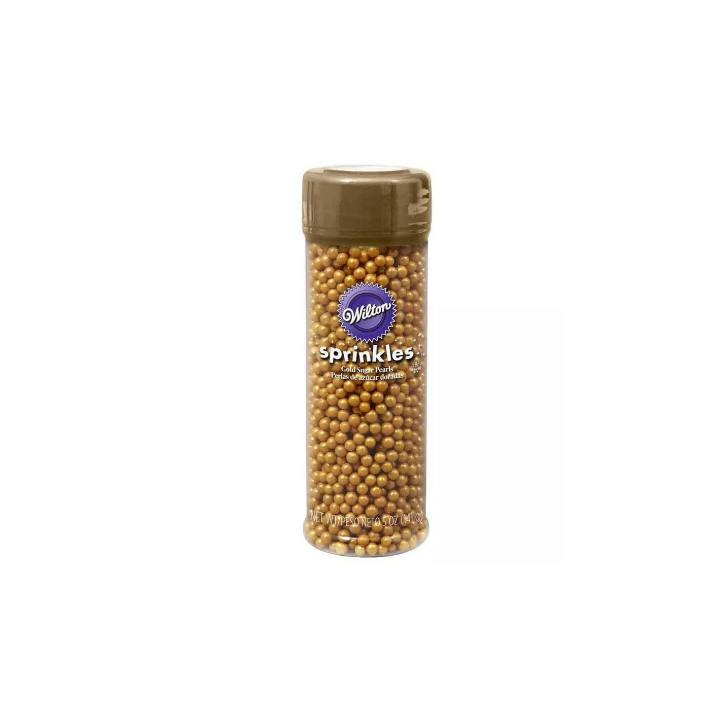 Las chispas de azúcar perladas doradas de Wilton agregan un toque de elegancia a los pasteles, cupcakes, galletas navideñas o dulces moldeados para ocasiones especiales.