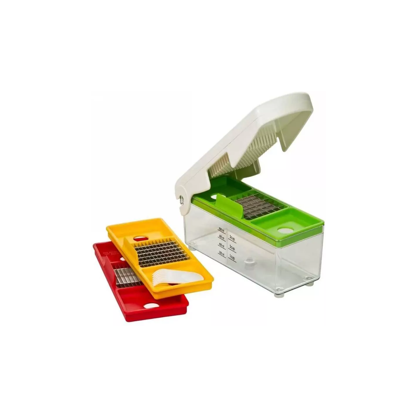 Este picador de frutas y verduras le permite cortar en rodajas, picar frutas y verduras con un simple movimiento presionando la tapa del empujador hacia abajo sobre los alimentos que descansan sobre las cuchillas. Las frutas y verduras cortadas caerán limpiamente en el contenedor de abajo, que incluye medidas impresas en el lateral y una base antideslizante
