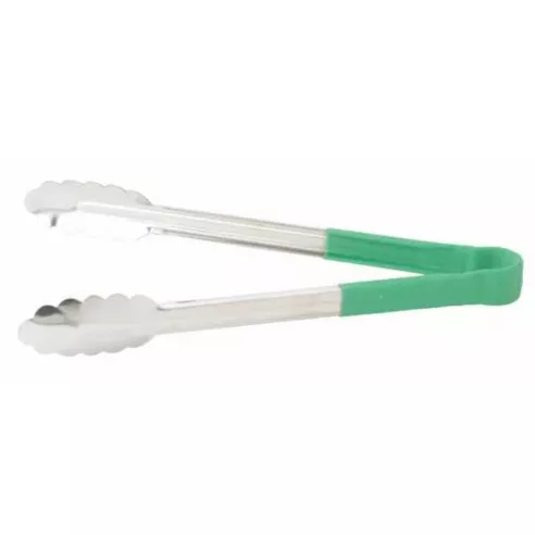 Estas pinzas resistentes hechas de acero inoxidable con mangos recubiertos de silicon son perfectas para mantener sus manos frescas con códigos de colores para mantener a raya la contaminación cruzada. Con una variedad de longitudes, estas herramientas son perfectas para cualquier cocina.
