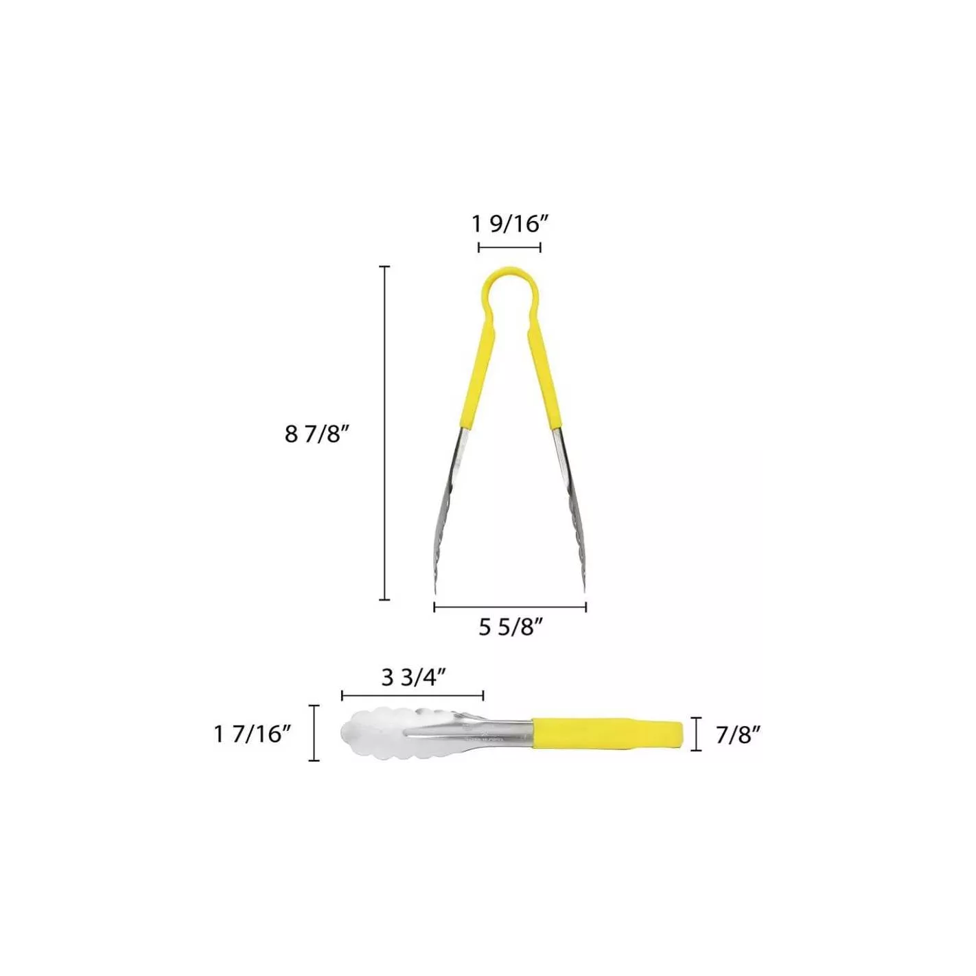 Estas pinzas están diseñadas con una construcción de una sola pieza, lo que garantiza que sean resistentes y fuertes, mientras que el mango amarillo antideslizante codificado por colores las hace fáciles de identificar y usar. Fabricadas con acero inoxidable de alta calidad, estas pinzas son duraderos y duraderos, lo que los convierte en una solución rentable para cualquier cocina ocupada. Ya sea que estés dando vuelta hamburguesas a la parrilla o sirviendo ensaladas en un buffet, estas pinzas son un accesorio imprescindible para cualquier chef profesional.