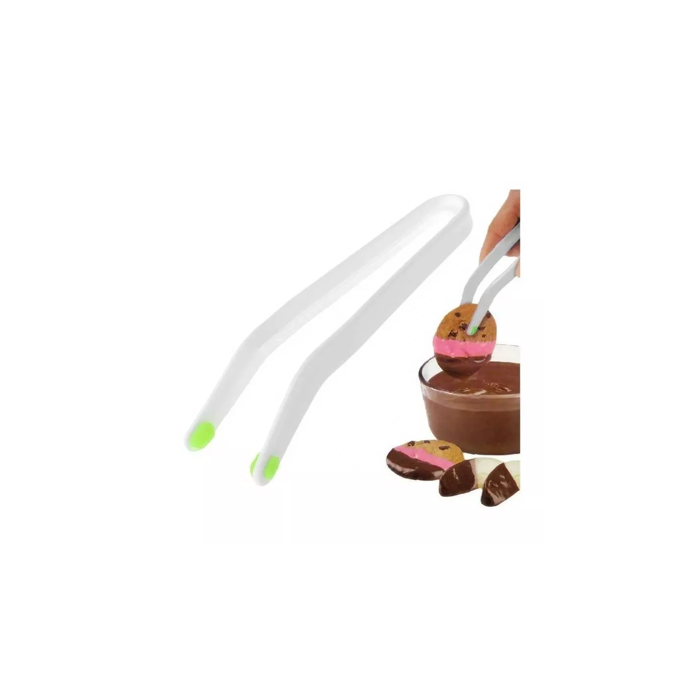 Estas pinzas son perfectas tanto para profesionales como para aficionados a la repostería, ayudando a realizar decoraciones elegantes y profesionales con facilidad. Su diseño ergonómico permite un manejo preciso y cómodo al sumergir galletas, frutas, bombones o cualquier postre en coberturas como chocolate, caramelo o glaseado. Fabricadas con plástico de alta calidad y puntas de silicona antideslizantes, estas pinzas garantizan una sujeción firme sin dañar los alimentos. Son ligeras, fáciles de usar y seguras para el contacto con alimentos. Además, gracias a su material resistente, son fáciles de limpiar y se pueden lavar a mano o en lavavajillas.
