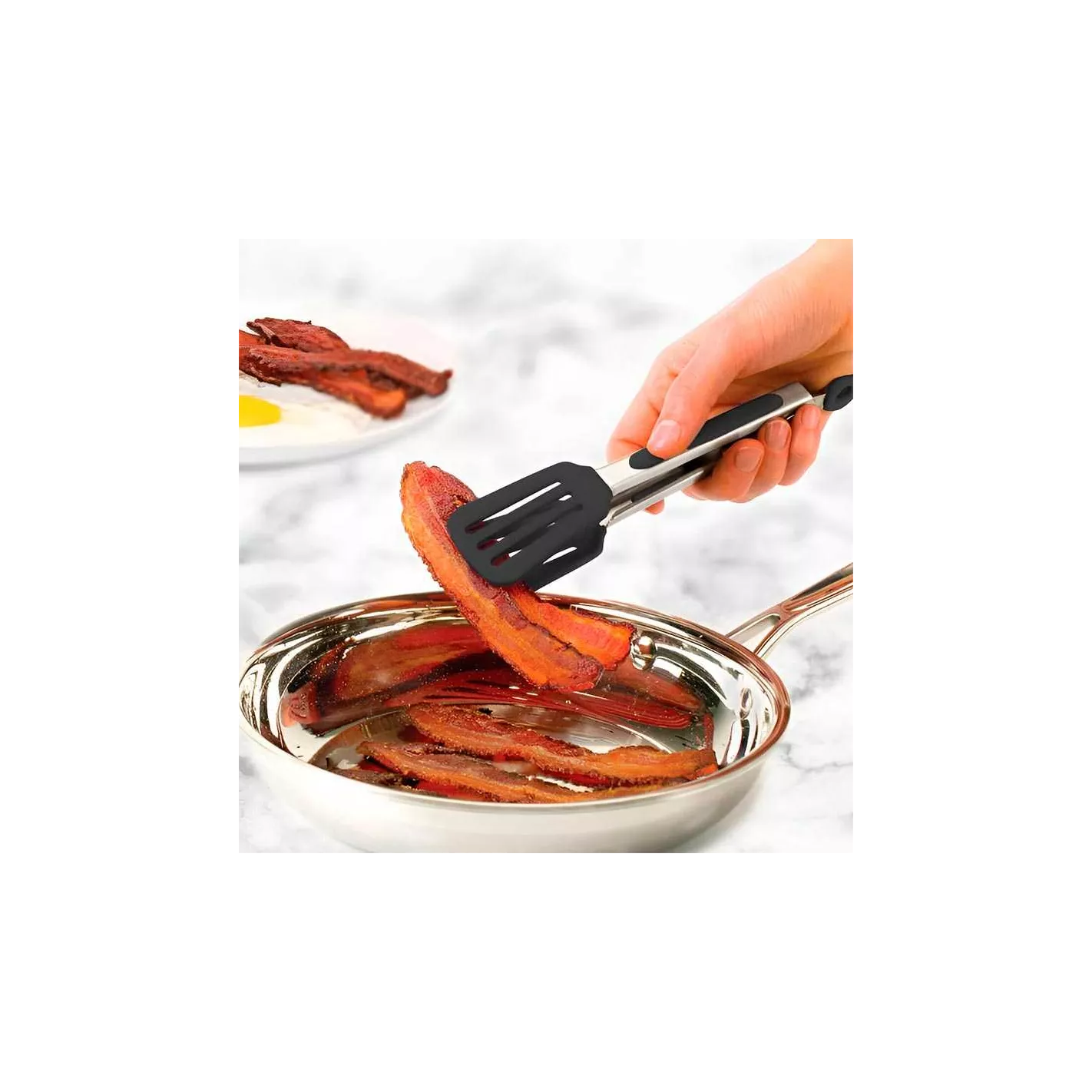 Estas pinzas pueden ser pequeñas, pero ofrecen el agarre, la fuerza y la versatilidad de un juego de tamaño completo. Su pequeño tamaño las hace ideales para trabajos pequeños o manos pequeñas: enseña a tus hijos a usar las cabezas anchas para dar vuelta hamburguesas, dar vuelta tiras de tocino y apilar panqueques o waffles. La silicona resistente al calor es perfecta para saltear, revolver y dar vuelta, ya que puede soportar temperaturas de hasta 600 grados y no raya los utensilios de cocina. Los extremos planos crean el agarre perfecto para tus alimentos más delicados. Este agarre suave permite una sujeción segura sin dañar tu comida. Las tiras de silicona antideslizante proporcionan un agarre fácil para dar vuelta y manipular los alimentos. La silicona suave al tacto se siente cómoda en la mano y evita que se resbalen accidentalmente debido a alimentos humeantes o salpicaduras de aceite.