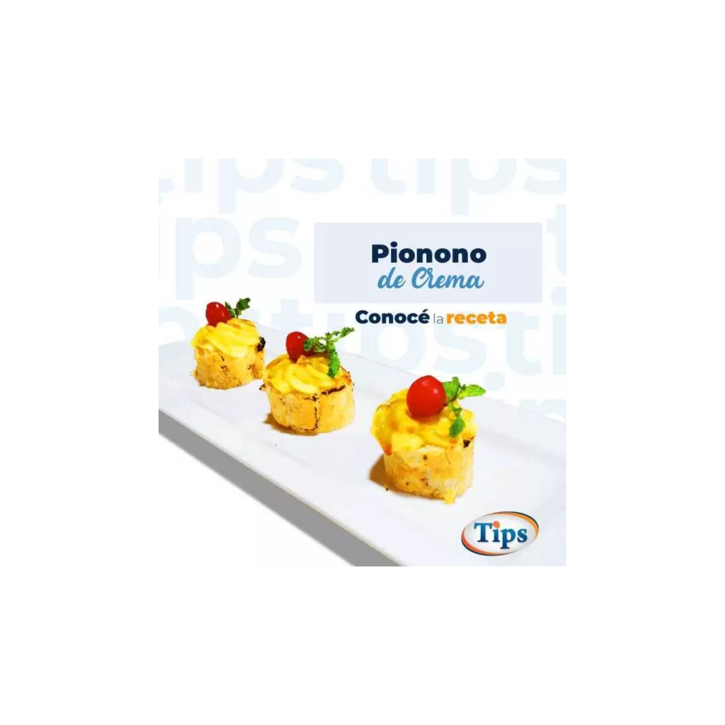 8-Coloque el pionono humedecer con el almíbar coloque una capa de crema pastelera arrolle nuevamente corte en rebanadas y coloque una roseta de crema pastelera azúcar extra y caramelizar con el soplete.