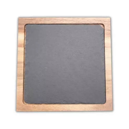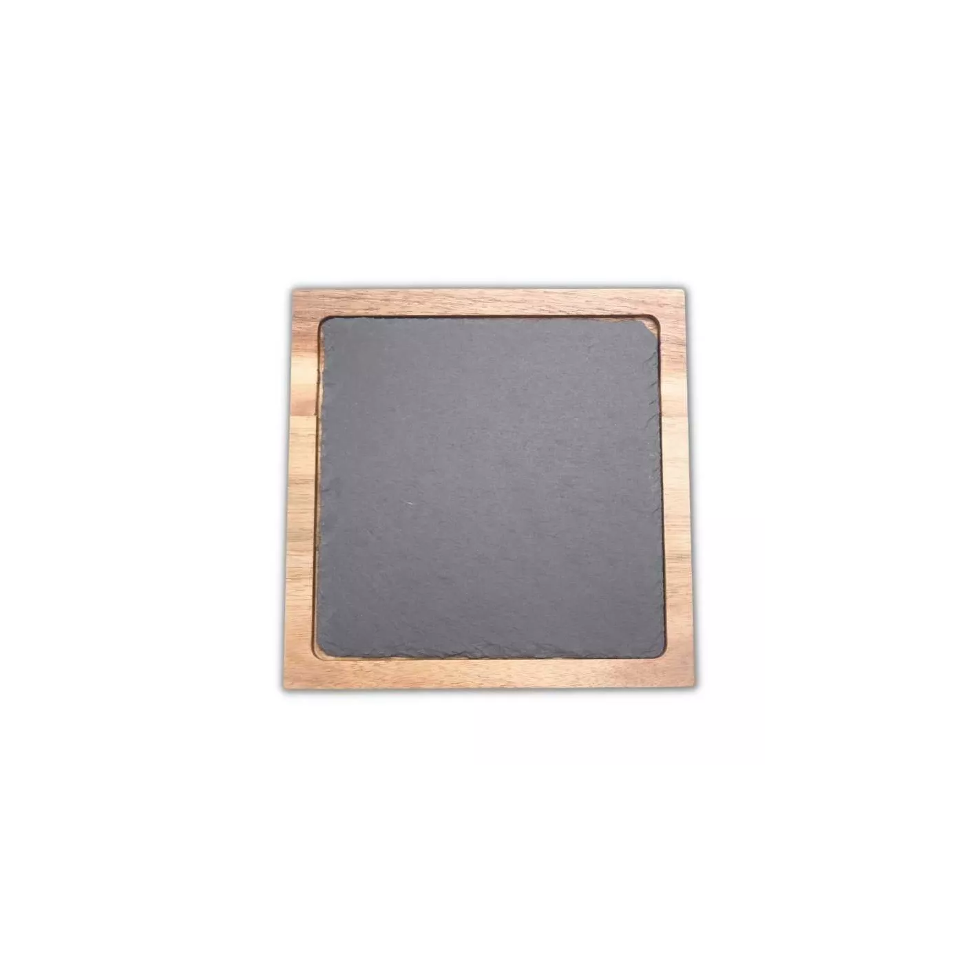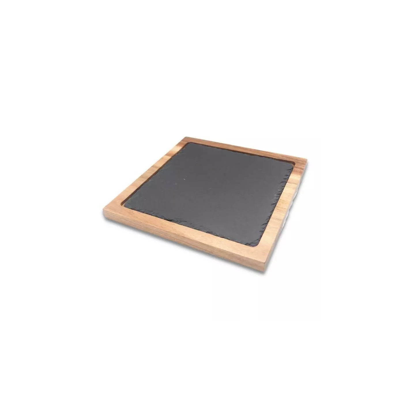 Plato Cuadrado de Piedra Pizarra de 22 Centimetros Color Negro con Base de Madera TIPS RSD01-49