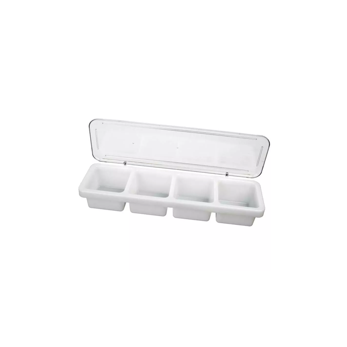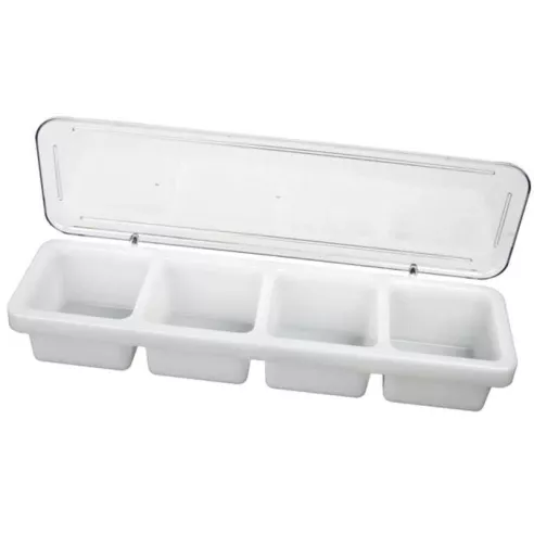 Una base de una sola pieza con 4 compartimentos crea un soporte perfecto para aceitunas, cerezas o condimentos, lo que hace que el almacenamiento sea muy fácil. Una cubierta significa que todos sus artículos se mantienen frescos y sanitarios durante todos los días. Medidas: 18.5 pulgadas de largo x 5.5 pulgadas de ancho x 3 pulgadas de profundidad.PROFUNDIDAD: PULGADAS = 3