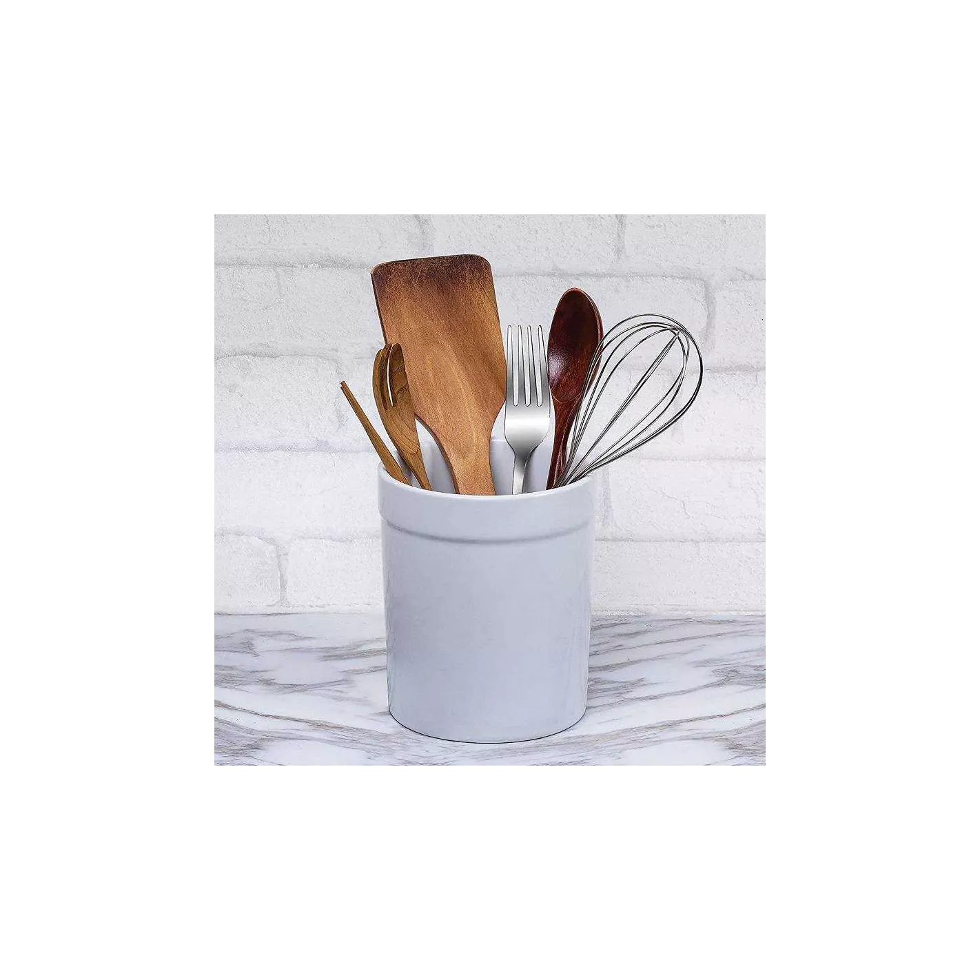 No más búsqueda frenética de utensilios mientras cocinas. Mantenga todos sus utensilios de cocina más utilizados al alcance de la mano, con este soporte para utensilios blanco. Este elegante soporte agregará comodidad, encanto y carácter a cualquier cocina. Es lo suficientemente grande para batidores, espátulas, tenazas o cucharones y lo suficientemente pesado como para evitar puntas y derrames. No ocupará mucho espacio en la encimera. Ordene un cajón de la cocina y mantenga sus utensilios cerca.