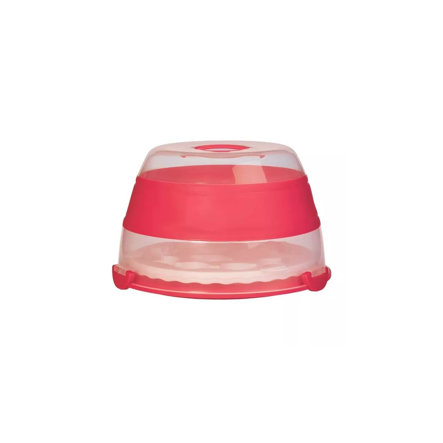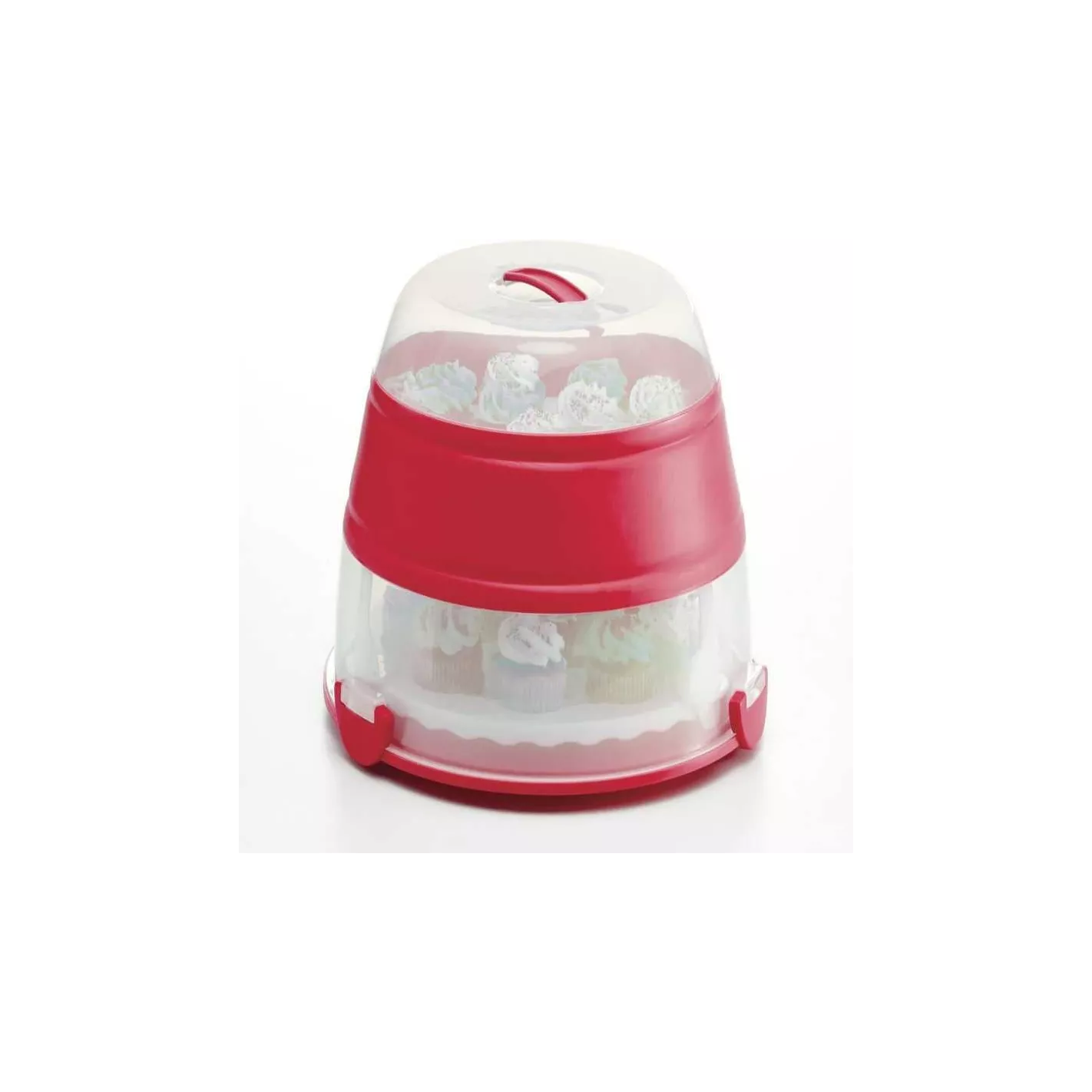 implemente quite las bandejas de cupcakes para acomodar pasteles redondos y cuadrados en capas y revelar la base plana con una guía de corte incorporada para servir pasteles en capas. Las bandejas de magdalenas se pliegan y se anidan dentro del porta pastel, que se pliega a to su altura original para un almacenamiento compacto. Este portador está patentado y se recomienda lavarse las manos.