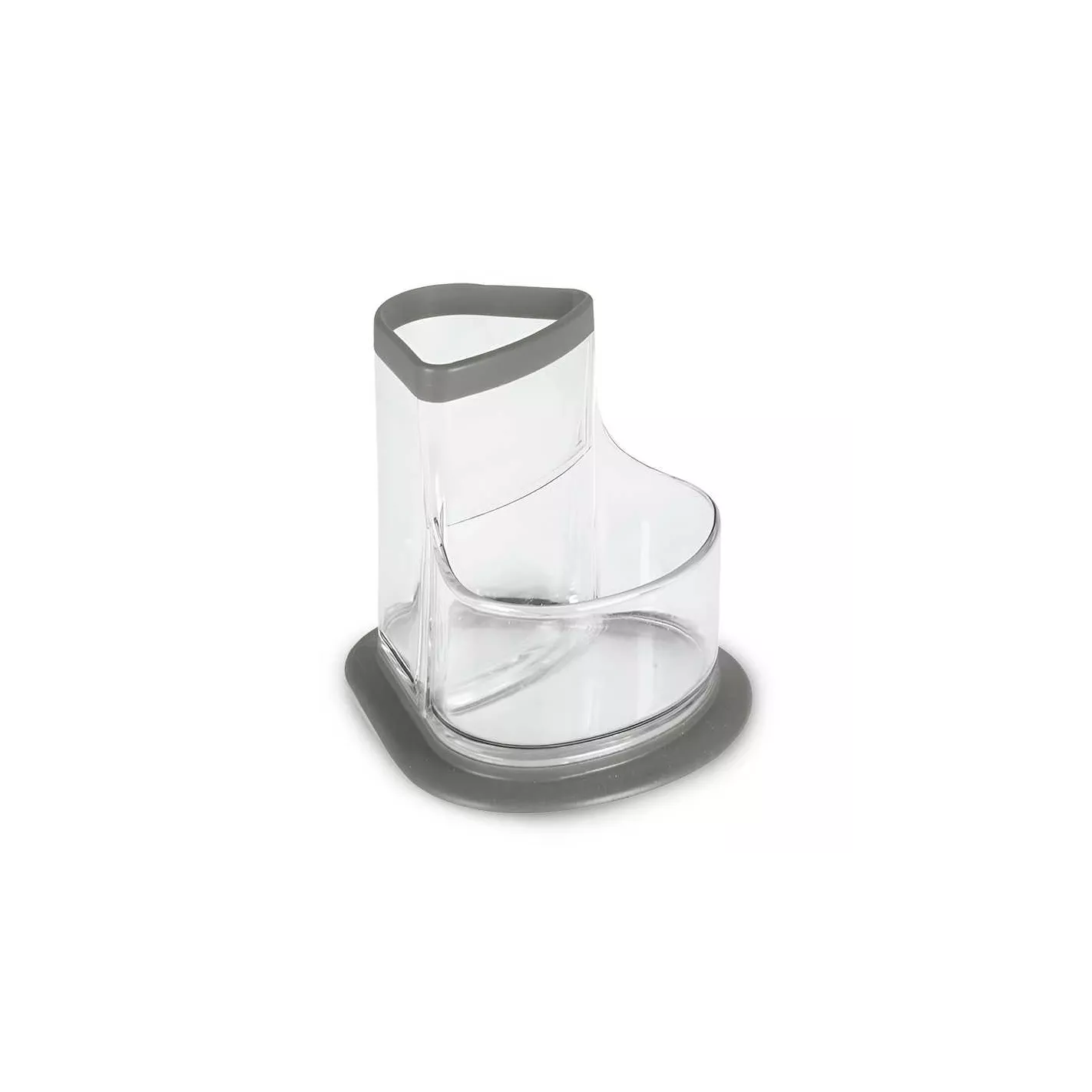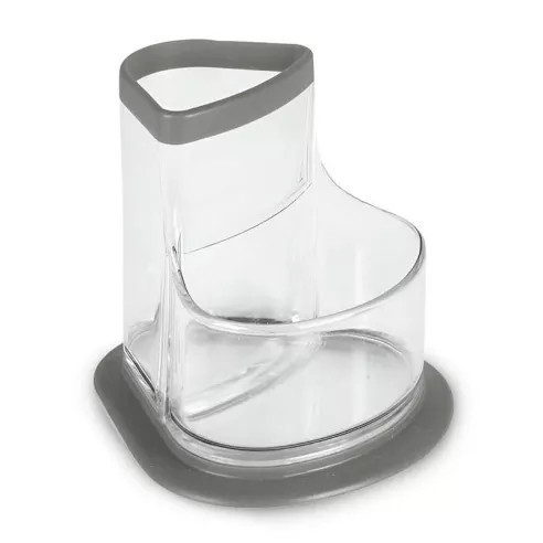 La base triangular proporciona estabilidad, lo que minimiza la posibilidad de que se vuelque. Los compartimentos dobles permiten almacenar esponjas y cepillos para fregar de distintos tamaños.
