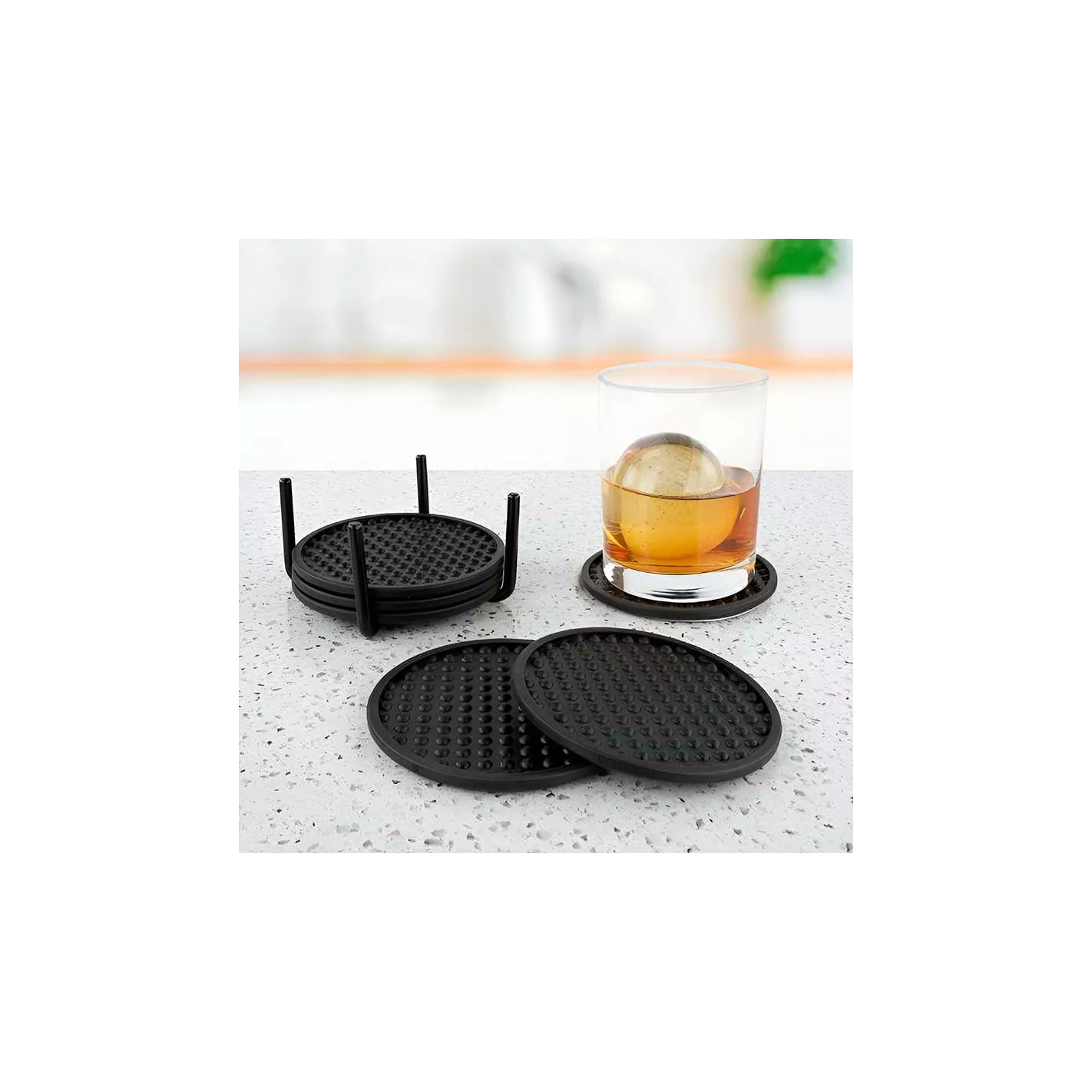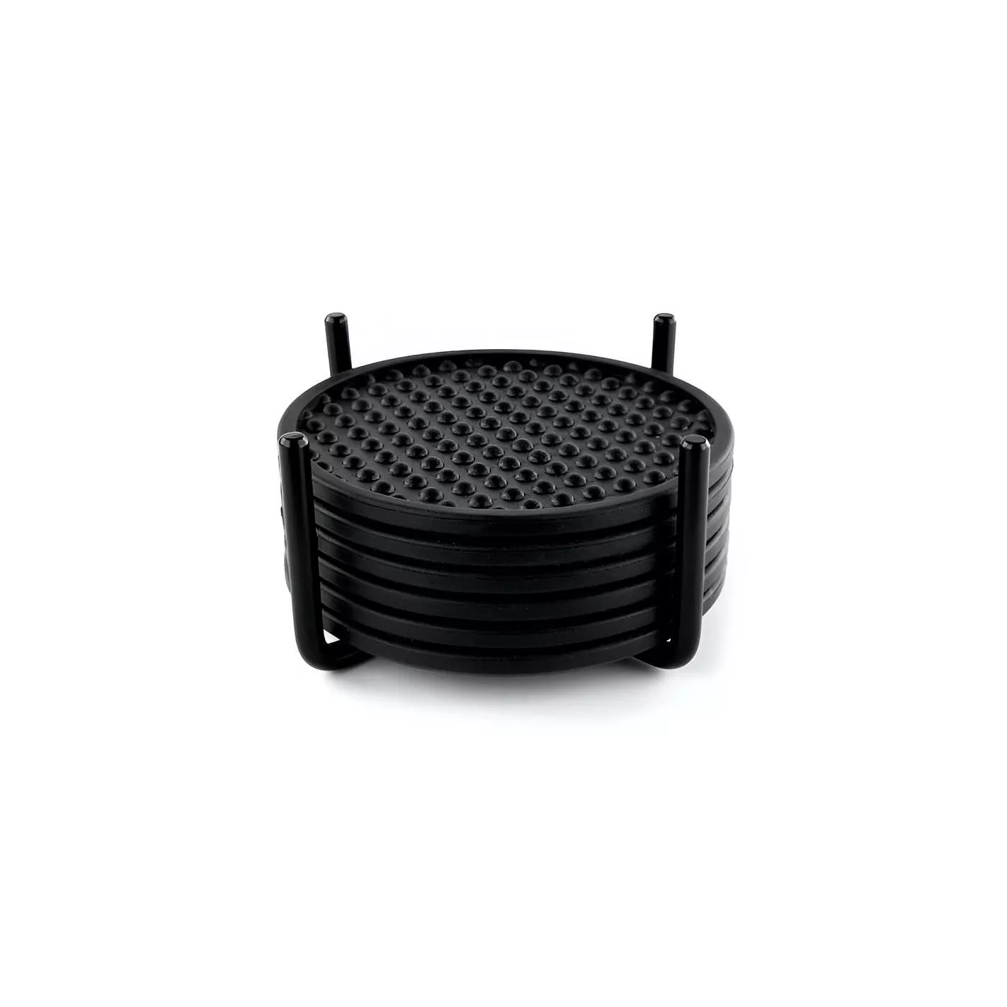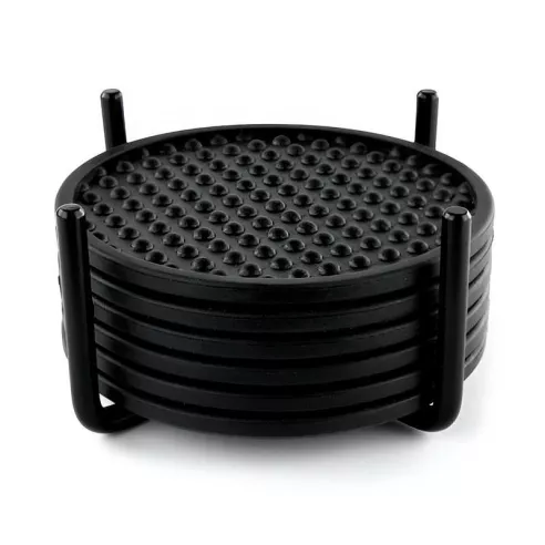 El juego incluye un soporte de acero resistente y seis posavasos flexibles de cuatro pulgadas diseñados con una superficie estampada y un borde elevado. Cuatro puntas redondeadas mantienen los posavasos dentro del soporte, lo que facilita el transporte del juego a donde sea necesario. La combinación de forma y función se traduce en una forma atractiva de mantener la humedad alejada de las superficies.