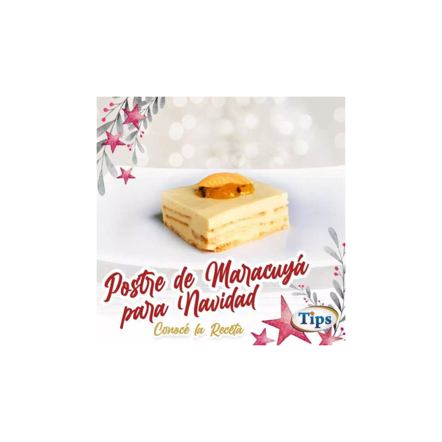 En un recipiente colocamos el jugo de naranja y sumergimos una por una las galletas y las vamos colocando en un pyrex rectangular de 20x30 ó uno cuadrado de 25x25, formando una capa con ellas, agregamos la mezcla de maracuyá y seguimos con otra capa de galletas hasta terminar toda la mezcla.