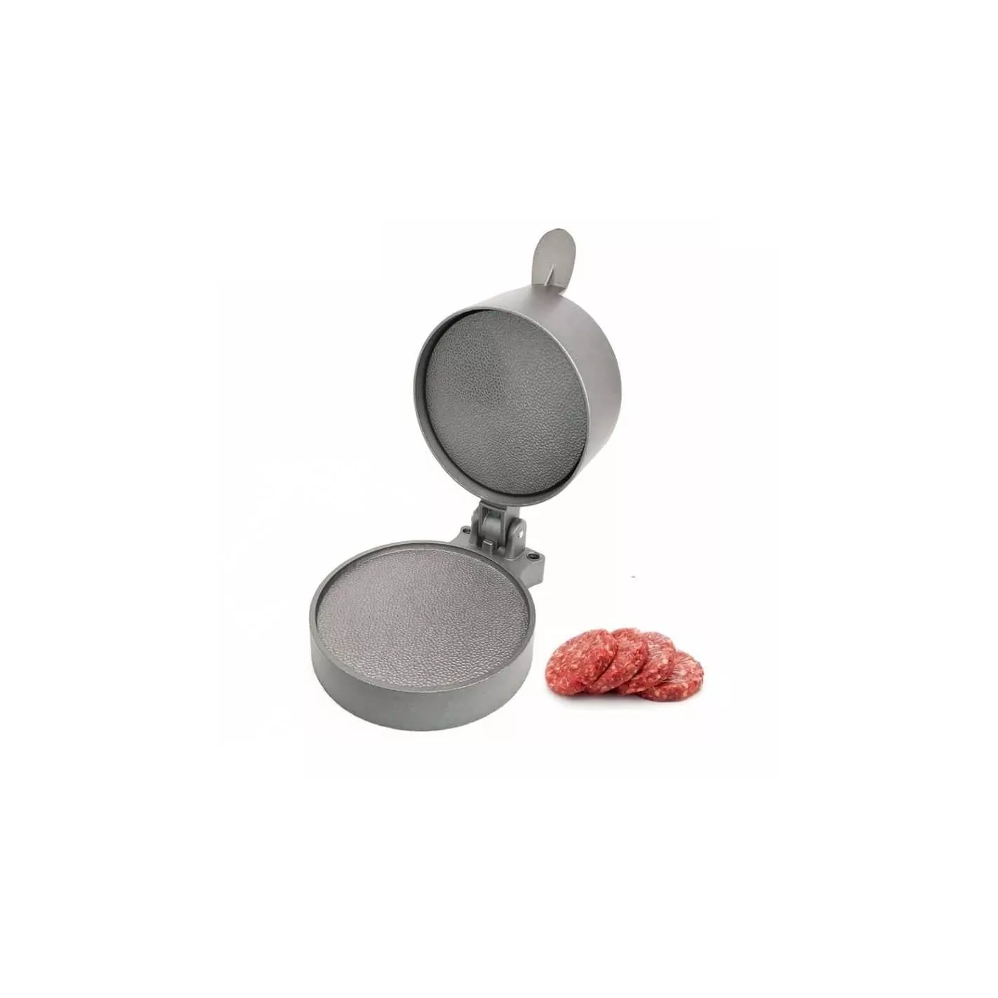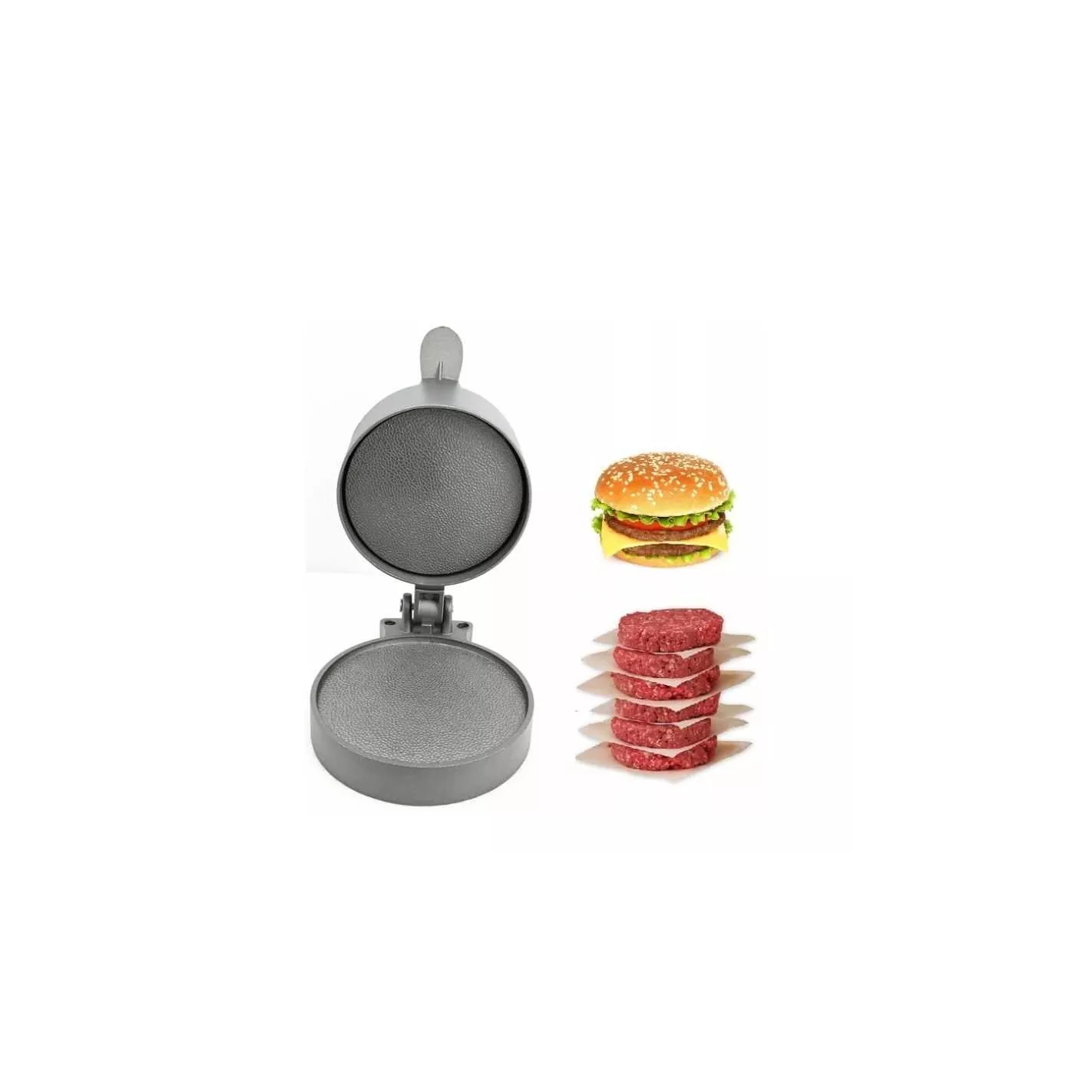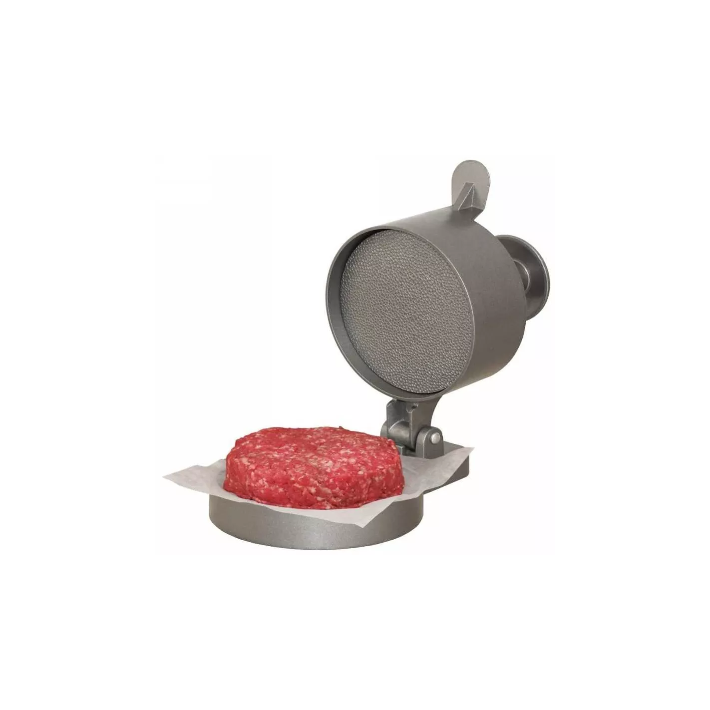 La prensa para hamburguesas con resorte, antiadherente y resistente, se puede ajustar a cualquier grosor de 1/4 a 1 pulgada usando la tuerca de mariposa en el resorte. Una vez que se haya decidido por el grosor, simplemente presione el botón superior hacia abajo y obtendrá una hamburguesa de 4-3/8 pulgadas perfectamente formada. Nunca más tendrá que preocuparse por tamaños de hamburguesa que no coincidan.
