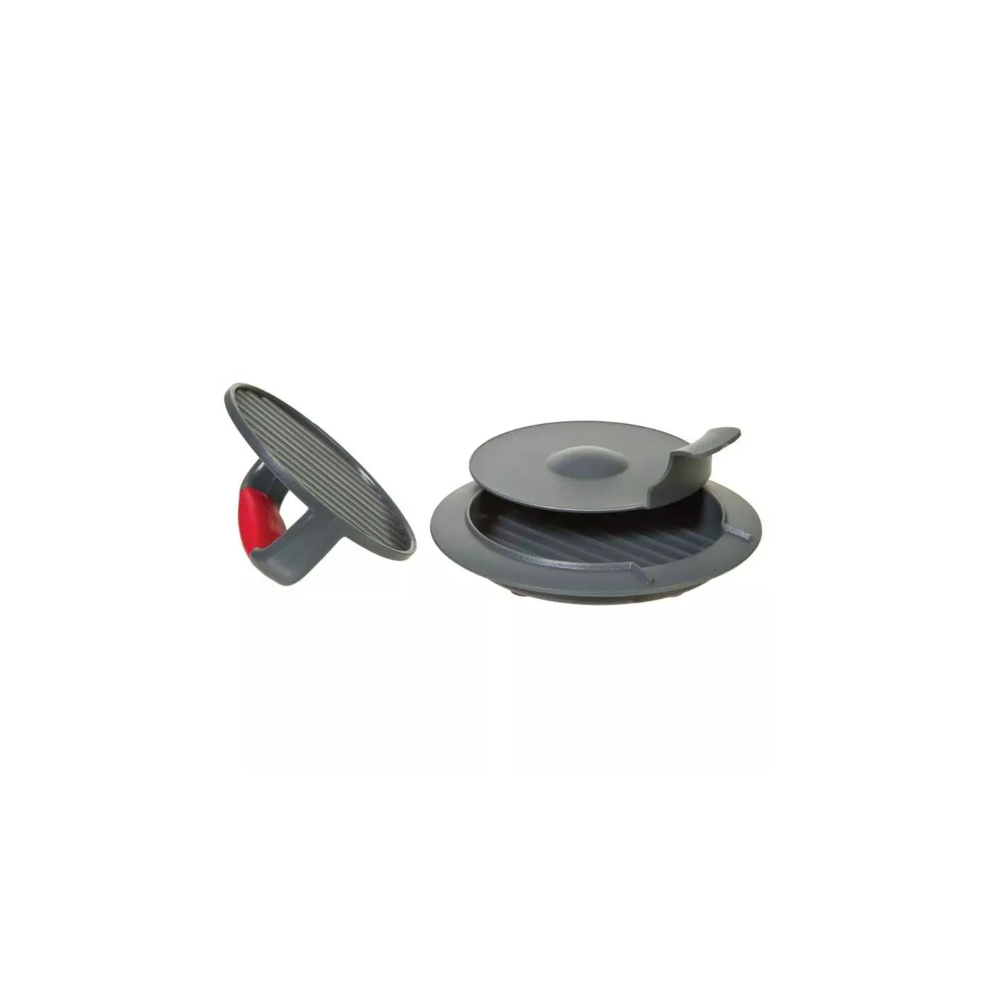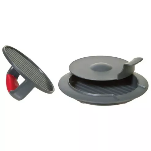 Nuestra prensa de hamburguesas perfecta te ofrece hamburguesas jugosas y de forma uniforme en todo momento. El "hoyuelo" creado por la prensa de hamburguesas perfecta permite que la hamburguesa se cocine rápida y uniformemente y mantenga su forma para una hamburguesa perfecta cada vez