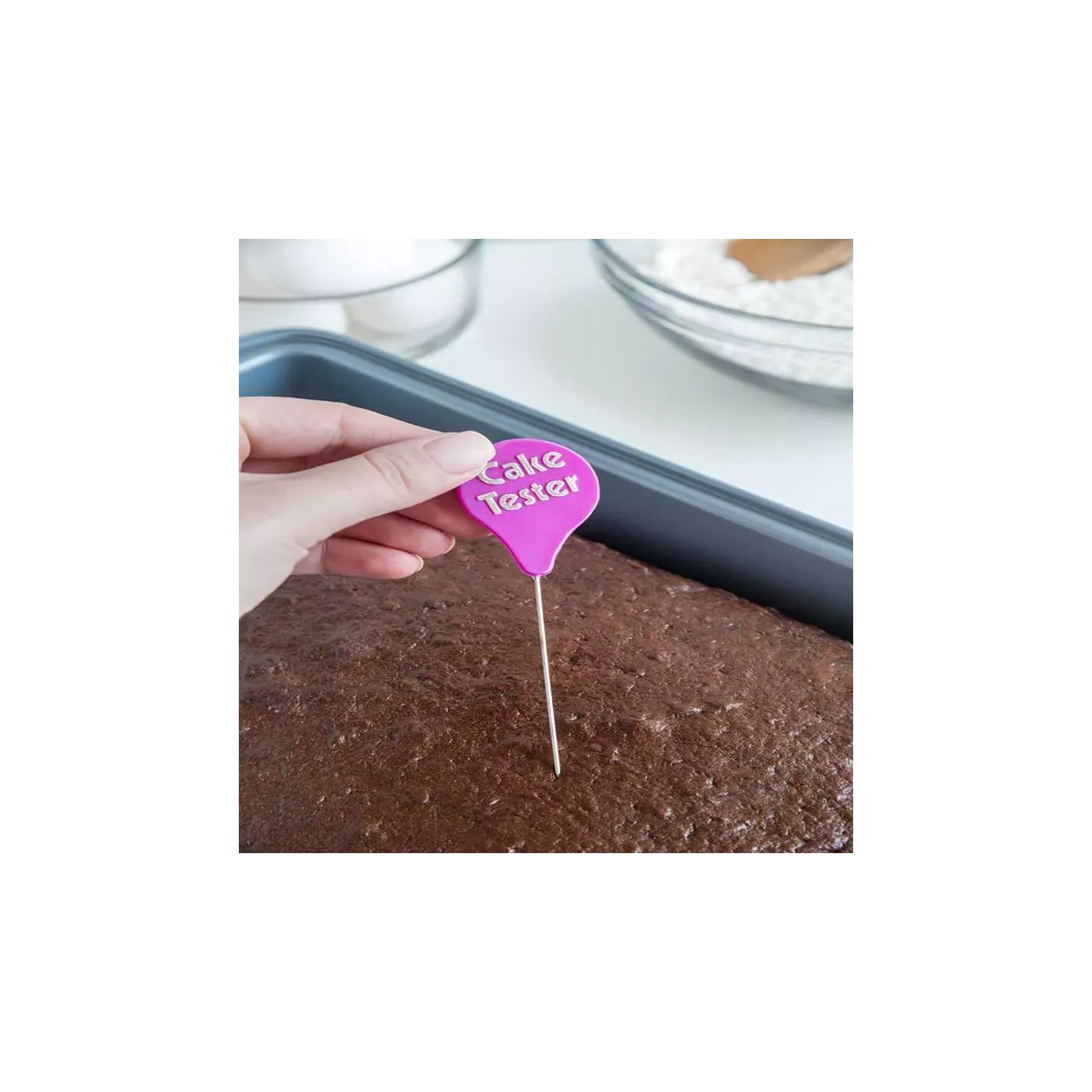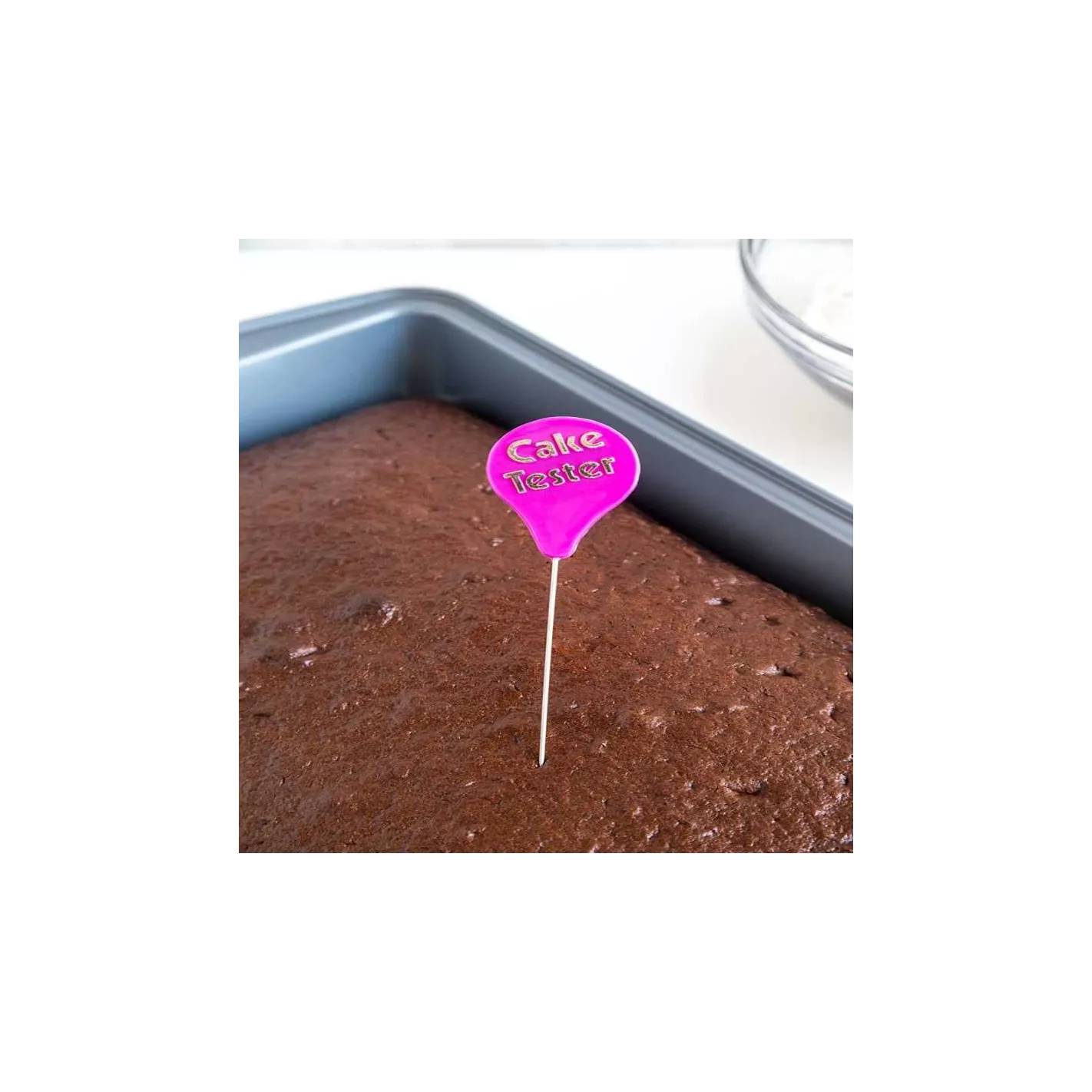 ¡Guarda ese palillo de dientes! Haga una tarea simple aún más fácil con nuestro Cake Tester. Hecho de estaño con una tapa de plástico, este utensilio imprescindible para panaderos es esencial para verificar si sus productos horneados están listos. Simplemente inserte el probador en el medio de su pastel y sáquelo. Si el probador sale limpio, ¡tu pastel está listo! Con una longitud de 7 pulgadas, este probador funciona con una variedad de productos horneados. ¡Más limpio, más largo y mejor que usar un palillo corto! El color de su probador puede variar.