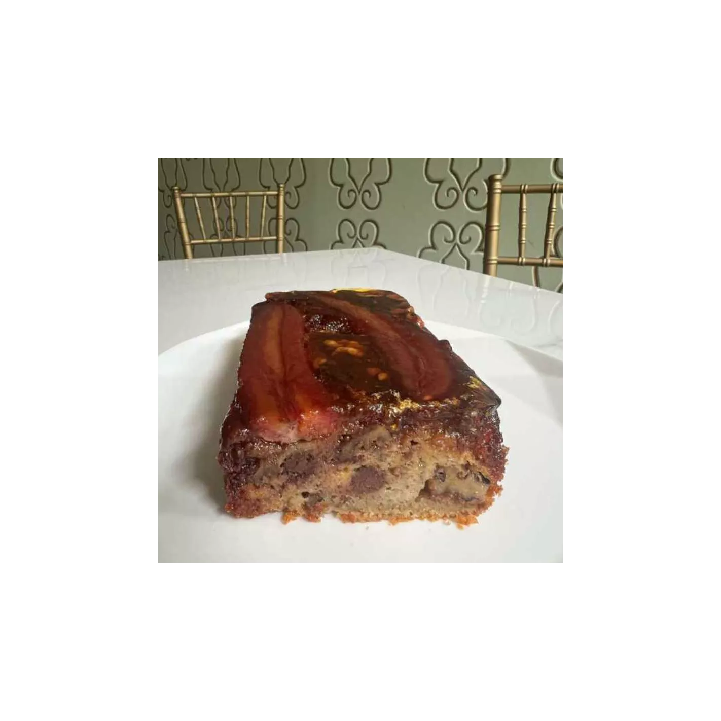 3-Trituras los bananos y agregar los huevos y vainilla, mezclar de manera envolvente con los huevos y tamizar los secos sobre la mezcla agregando un tercio, mover con espátula y agregar la mitad de la mantequilla, otra parte de los secos, otra de mantequilla y terminar con secos, agregar el resto de las nueces y chispas de chocolate, no sobre batir, verter sobre el molde con el almíbar y bananos y llevar al horno precalentado a 350ºf por aproximadamente 45min, o hasta revisar que ya esté.