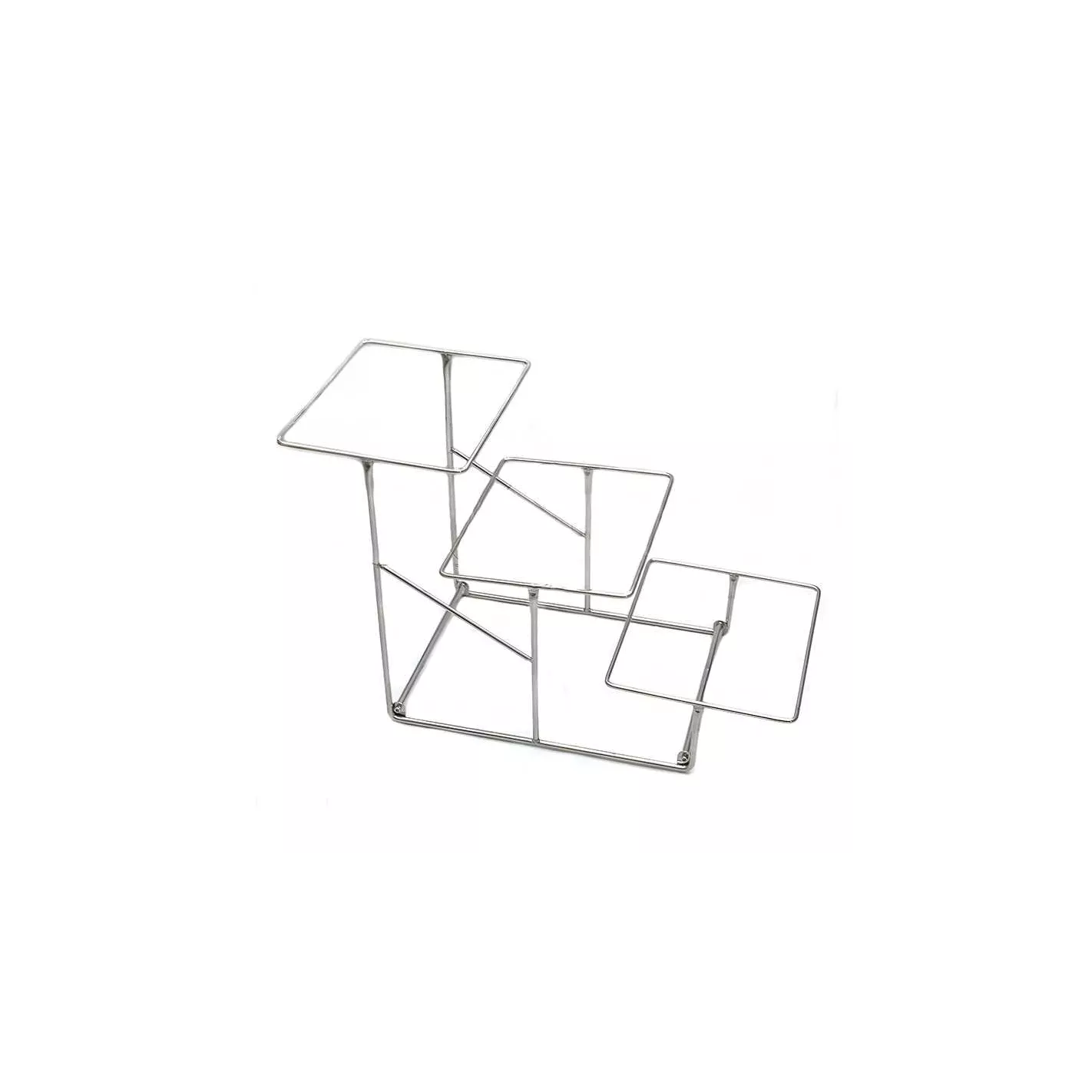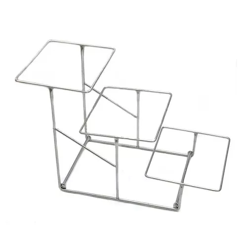 La base exhibidora consta de tres niveles o estantes, uno situado encima del otro, que ofrecen espacio adicional para exhibir productos o aperitivos. Esta disposición de niveles proporciona una presentación más dinámica y permite mostrar una mayor cantidad de productos en un área determinada.