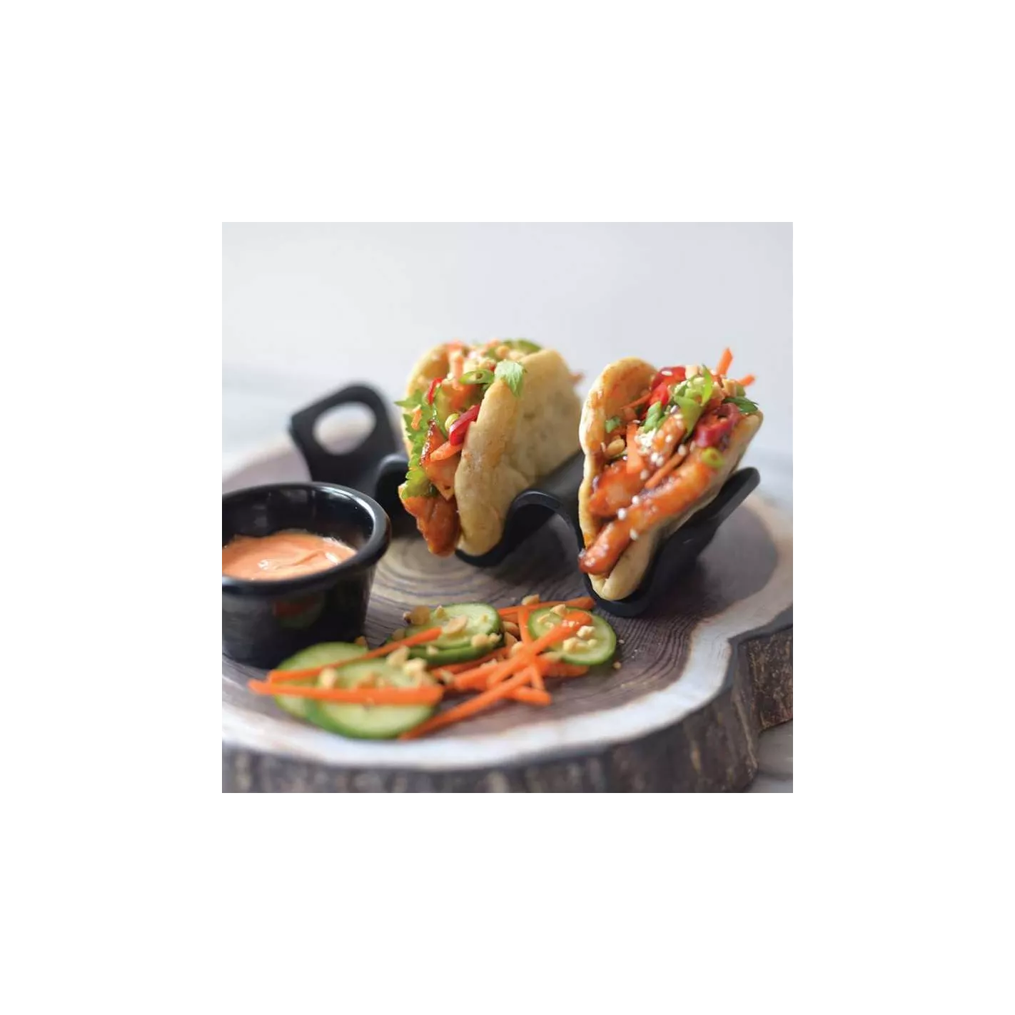 Este soporte para tacos no solo es una excelente presentación, sino que también facilita la adición de una variedad de rellenos salados. Los chefs pueden preparar la comida de manera rápida y eficiente, mientras que los invitados pueden disfrutar de sus tacos a su propio ritmo e incluso ponerlos a descansar entre bocado y bocado. Además, cuenta con asas para que sea más fácil levantarlo y colocarlo en el suelo.