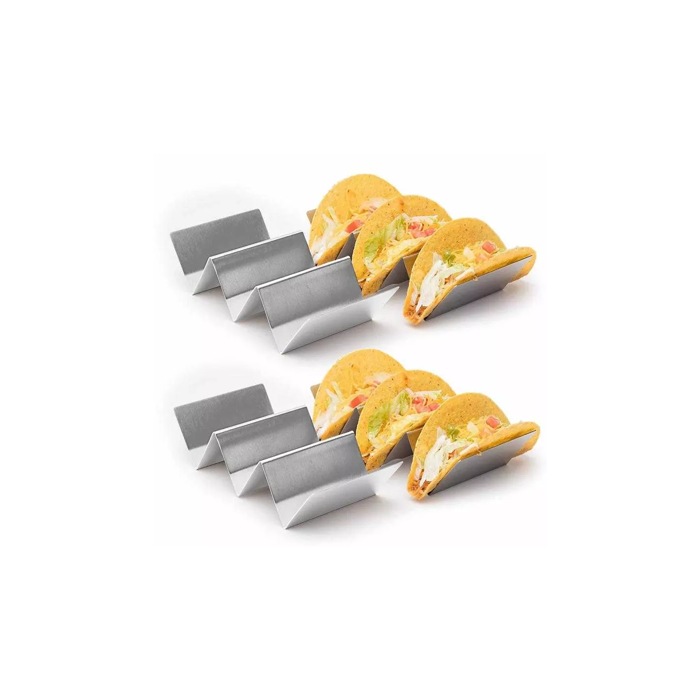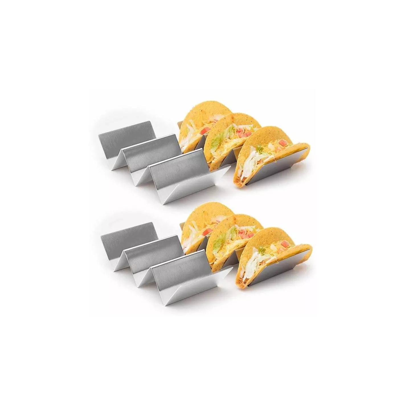 Rack de acero inoxidable para tacos de 2 y 3 cavidades es ideal para crear sus propios tacos sin que se destruya la carcasa. Gracias a este rack puedes impresionar a tus invitados en cualquier ocasión especial. Este rack de 8 x 4 pulgadas resiste a temperaturas calientes perfecto para horno o parrilla. Este molde también le permite exhibir sus creaciones como perros calientes.
