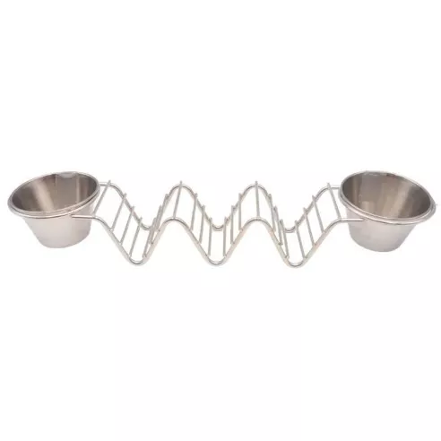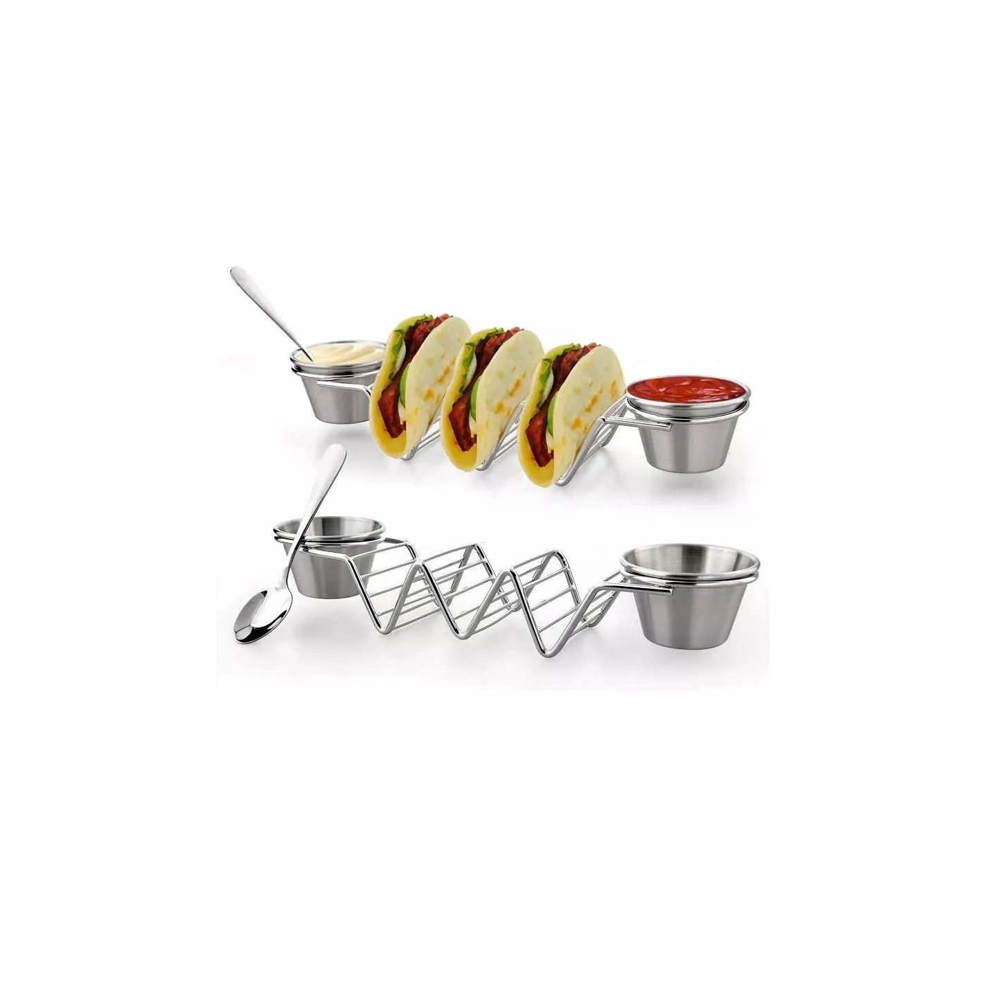 Cada soporte para tacos viene con dos tazas laterales, por lo que todo el mundo puede tener su salsa favorita de fiesta justo al lado de ellos, que es muy conveniente y elegante. Estructura de acero inoxidable antióxido, mejora la durabilidad y rigidez de los soportes de carcasa de taco.