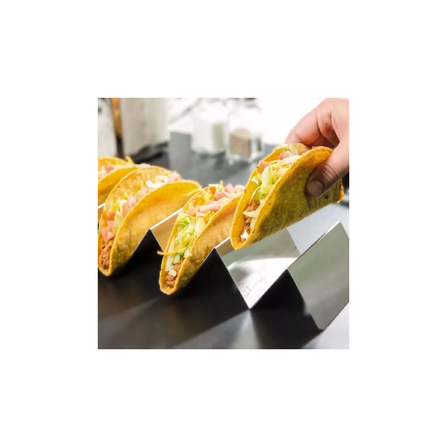 Rack de acero inoxidable para tacos de 4 y 5 cavidades es ideal para crear sus propios tacos sin que se destruya la carcasa. Gracias a este rack puedes impresionar a tus invitados en cualquier ocasión especial. Este rack de 13.5 x 4 pulgadas resiste a temperaturas calientes perfecto para horno o parrilla. Este molde también le permite exhibir sus creaciones como perros calientes.