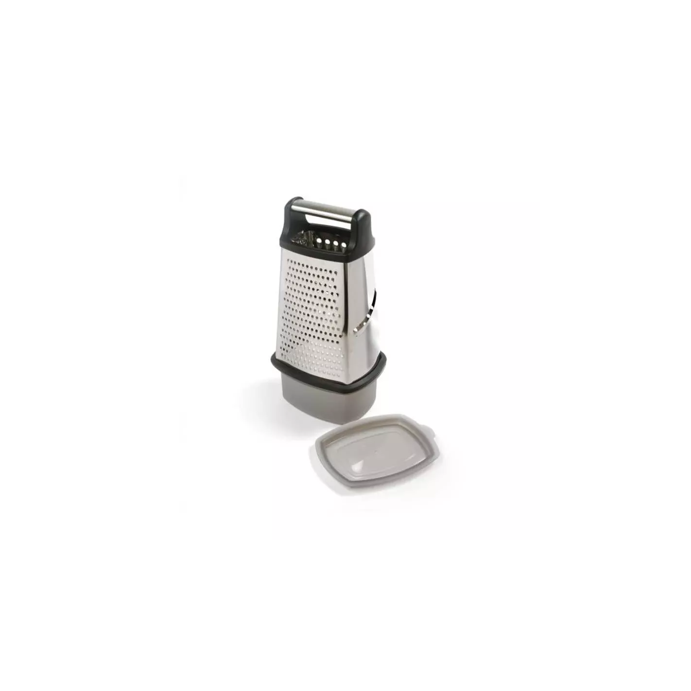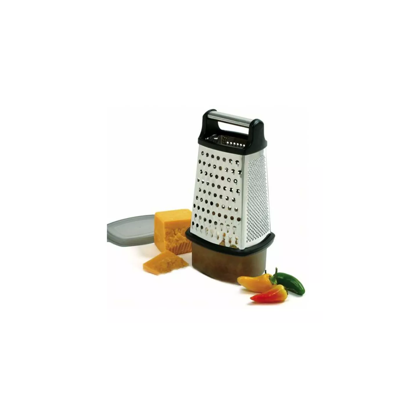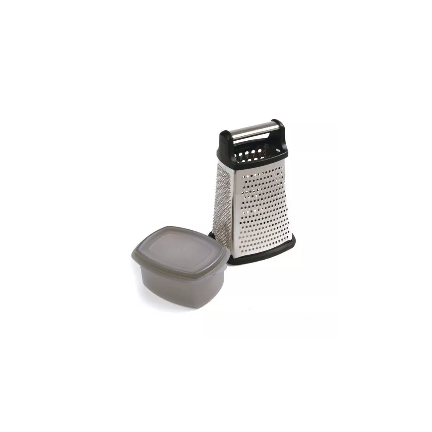 Contiene una rejilla fina, una mediana, una gruesa y una superficie de corte con una tapa para un almacenamiento conveniente. Base de goma antideslizante.