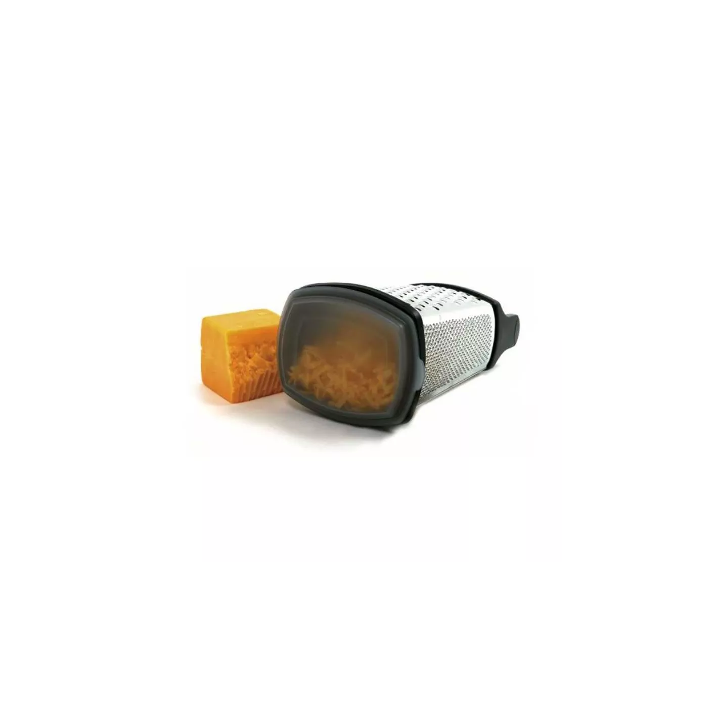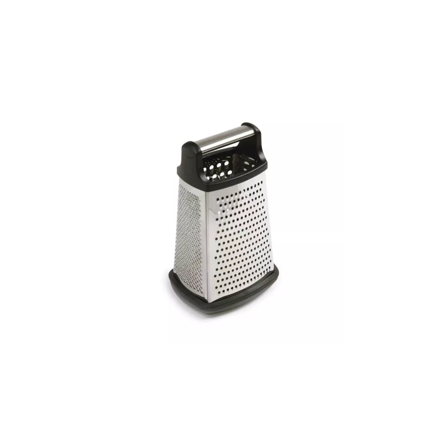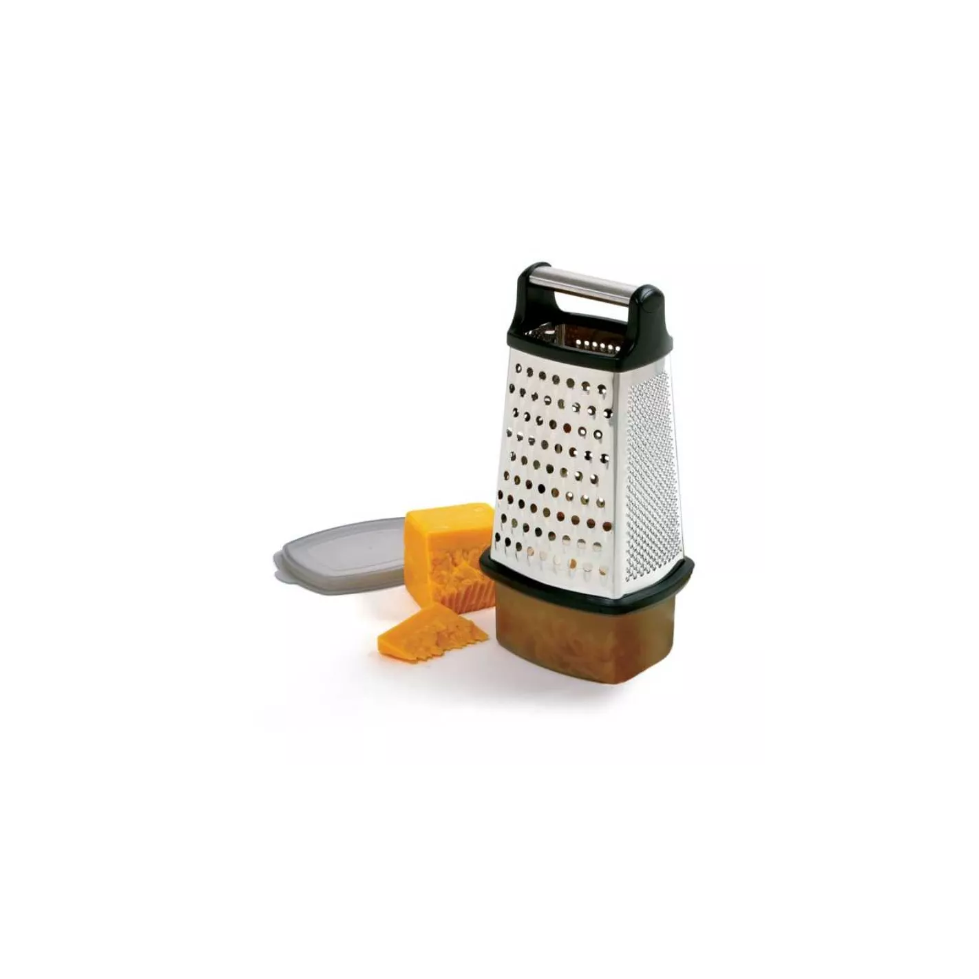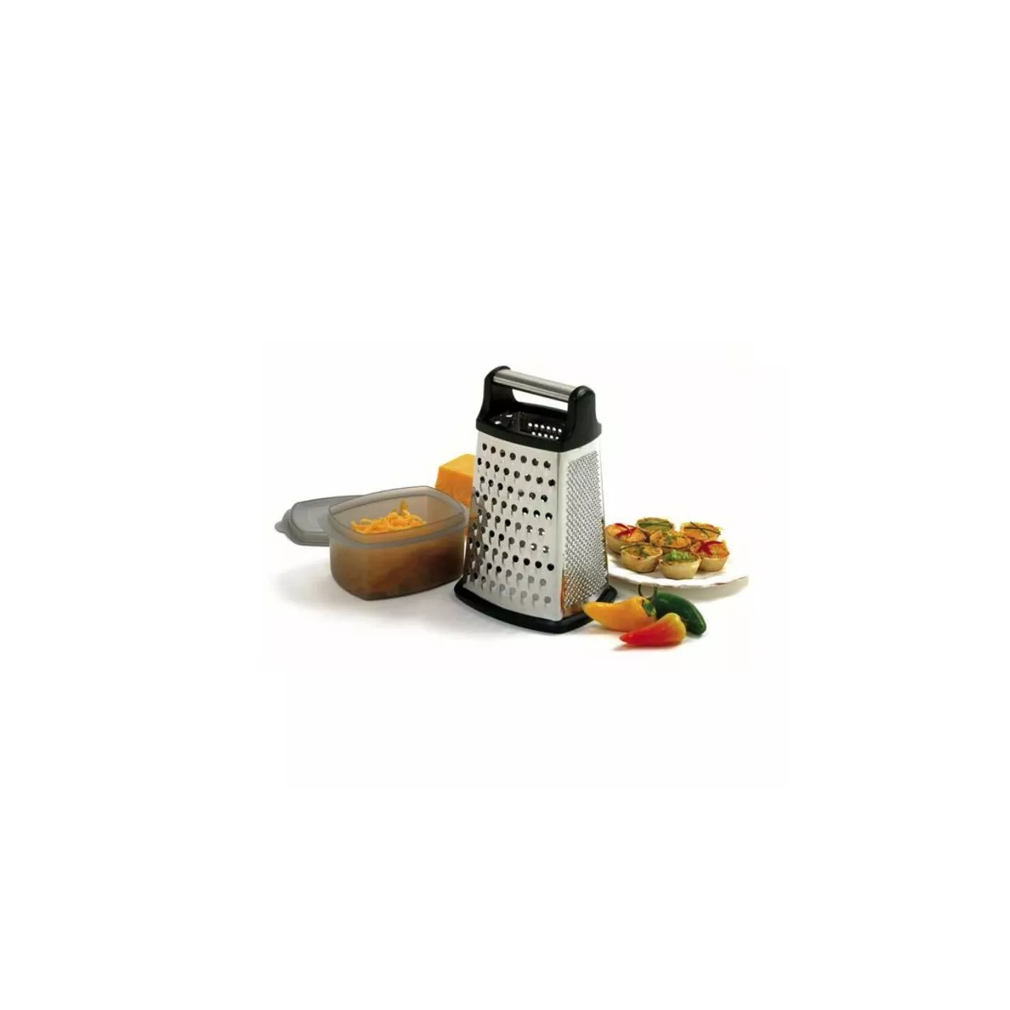 Contiene una rejilla fina, una mediana, una gruesa y una superficie de corte con una tapa para un almacenamiento conveniente. Base de goma antideslizante.