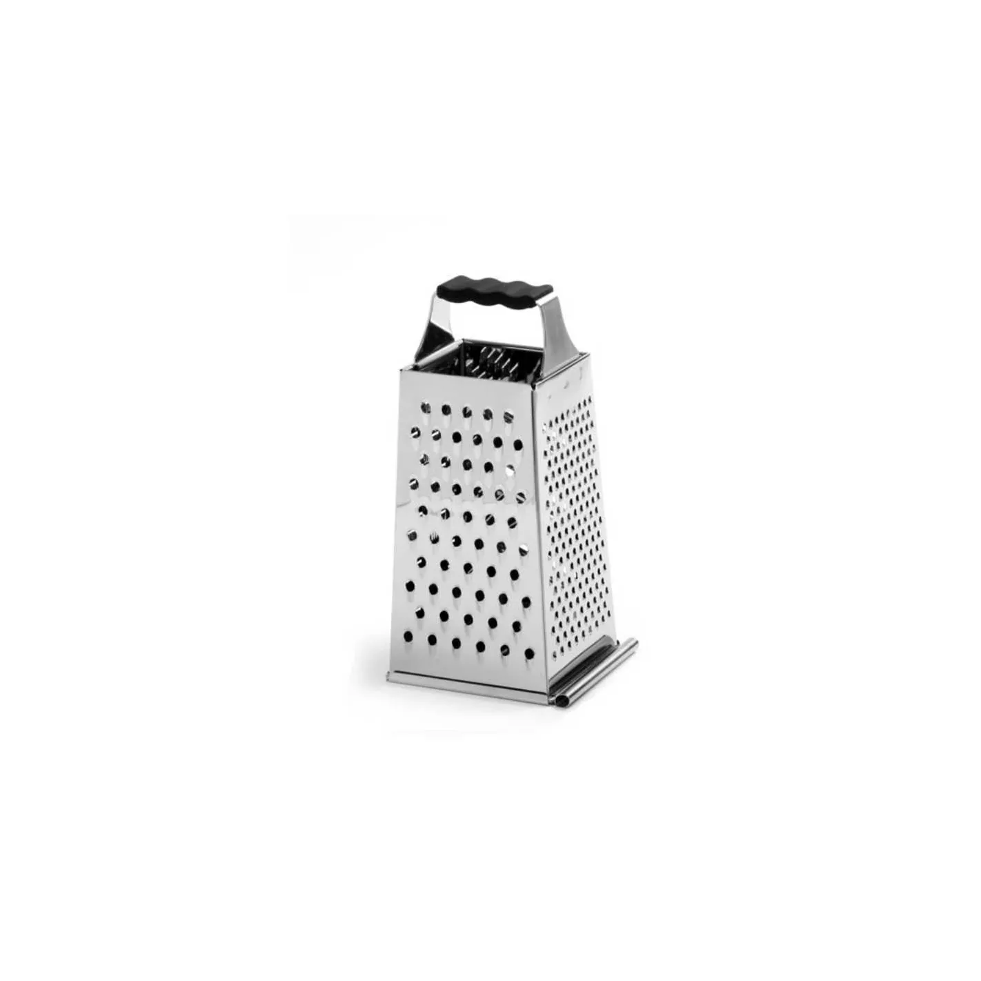 Este rallador de caja de acero inoxidable tiene superficies de rallado fino, mediano y grueso y una superficie para rebanar. La bandeja deslizante en la parte inferior le permite transportar el contenido. Mango de santopreno suave para reducir la fatiga de las manos.