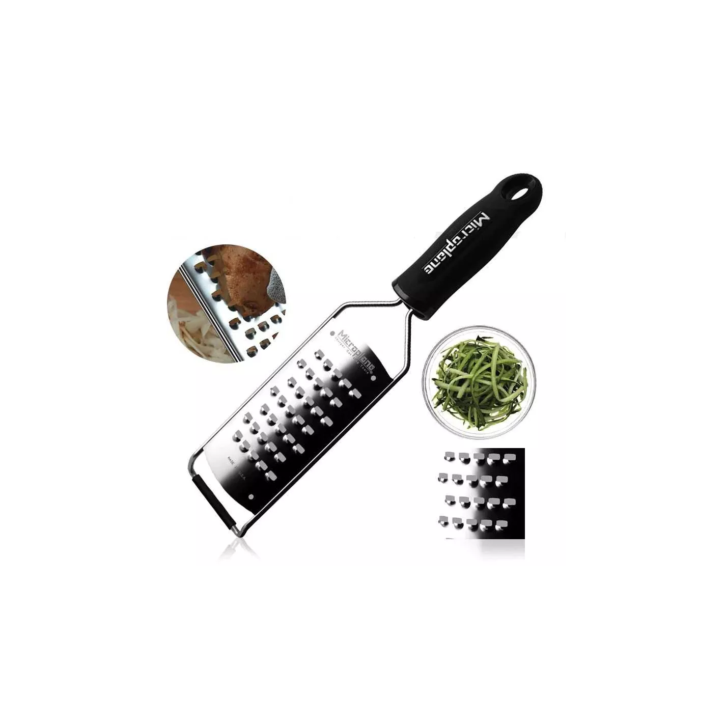 La serie Microplane Gourmet tiene una paleta expansiva con amplias superficies de rejilla y hojas de acero inoxidable. Los dientes fotograbados ultrafilados agilizan el rallado de patatas, zanahorias, cebollas y quesos. El marco de acero inoxidable proporciona una durabilidad extraordinaria. El mango suave al tacto coincide con los zesters de la serie clásica premium. El pie antideslizante agrega estabilidad al rallar en mostradores y platos.