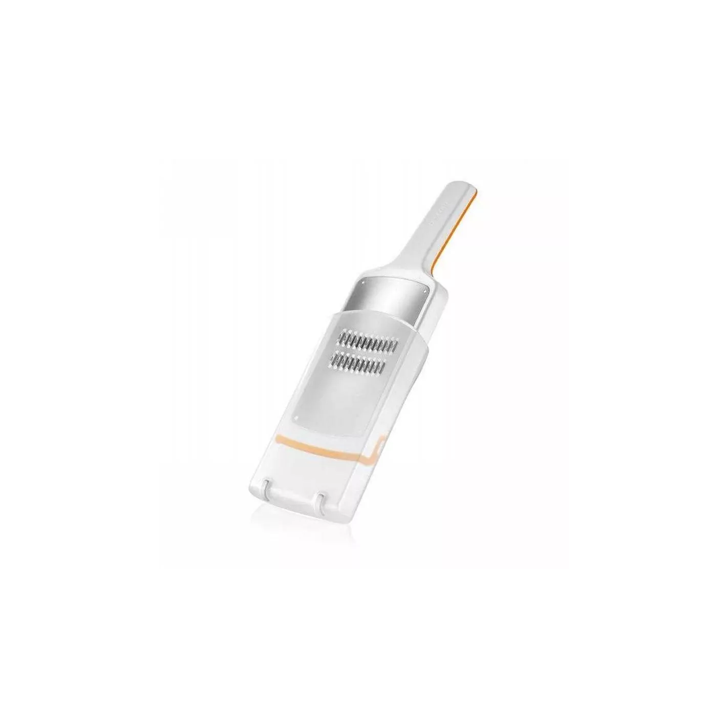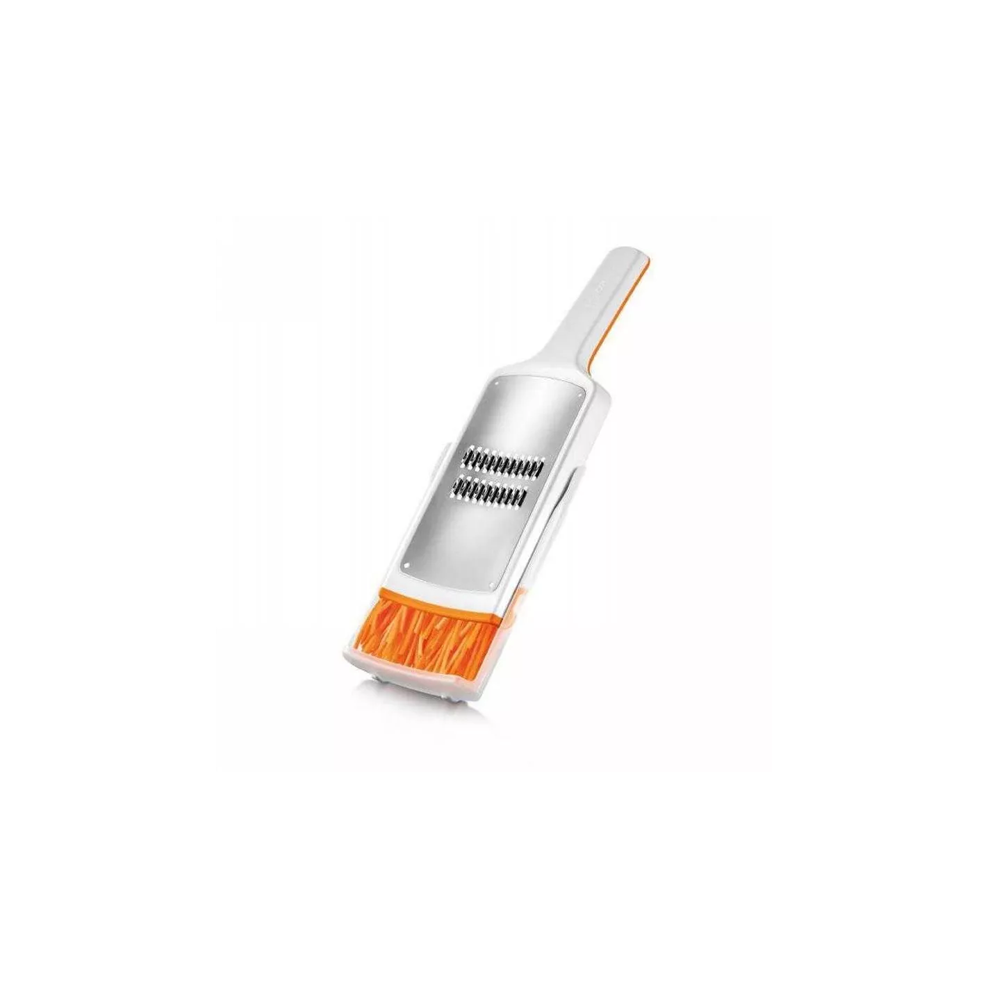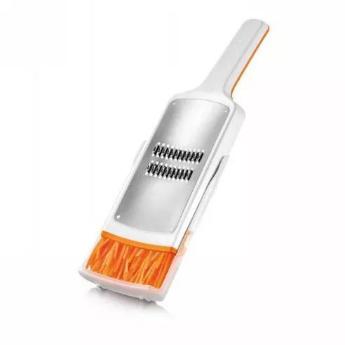 Hojas extra afiladas y resistentes de acero inoxidable de alta calidad para preparar finas tiras de juliana a partir de zanahorias, apio, papas, rábano blanco, etc. Las cuchillas del rallador son extremadamente afiladas. Siempre almacene el rallador con el protector protector puesto. Dimensiones: 9.5 x 29.5 centímetros