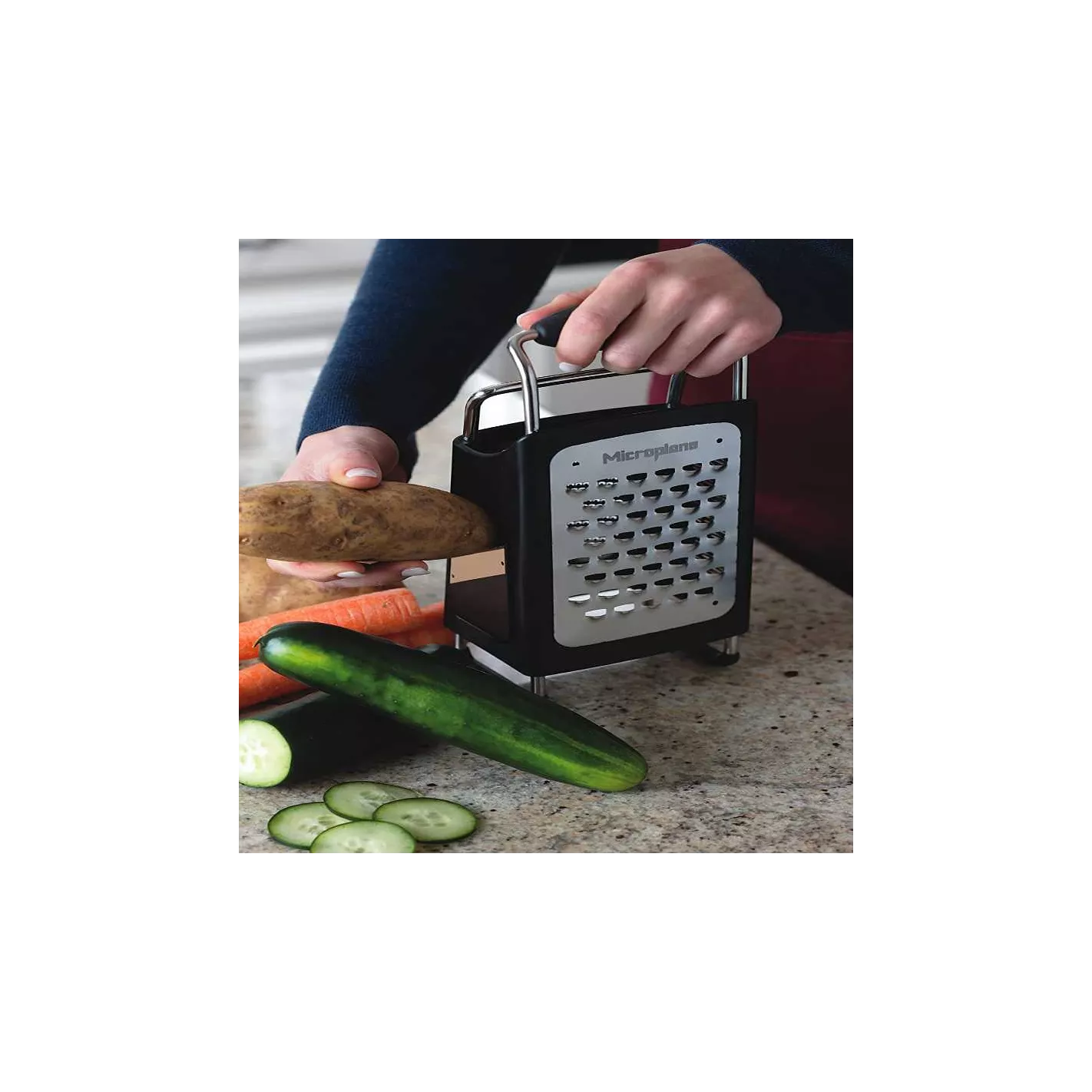 Todo lo que necesitas: incluye tres de las superficies de la hoja de rallado más utilizadas (ultra gruesa, fina, cinta), además de una hoja de rebanado. Con estas cuchillas originales y ultra afiladas, tu experiencia de rallado no será aburrida. El mango es fácil de agarrar, y se incluye una base para mantener las manos seguras cuando la unidad está almacenada. Fácil de limpiar: el panel de cuchilla fina se desprende. Esta característica le permite limpiar todos los rincones y grietas donde se pueden acumular partículas de queso y vegetales. Además, este artículo se puede meter en el lavavajillas sin miedo a la oxidación, ya que las cuchillas son de acero inoxidable.