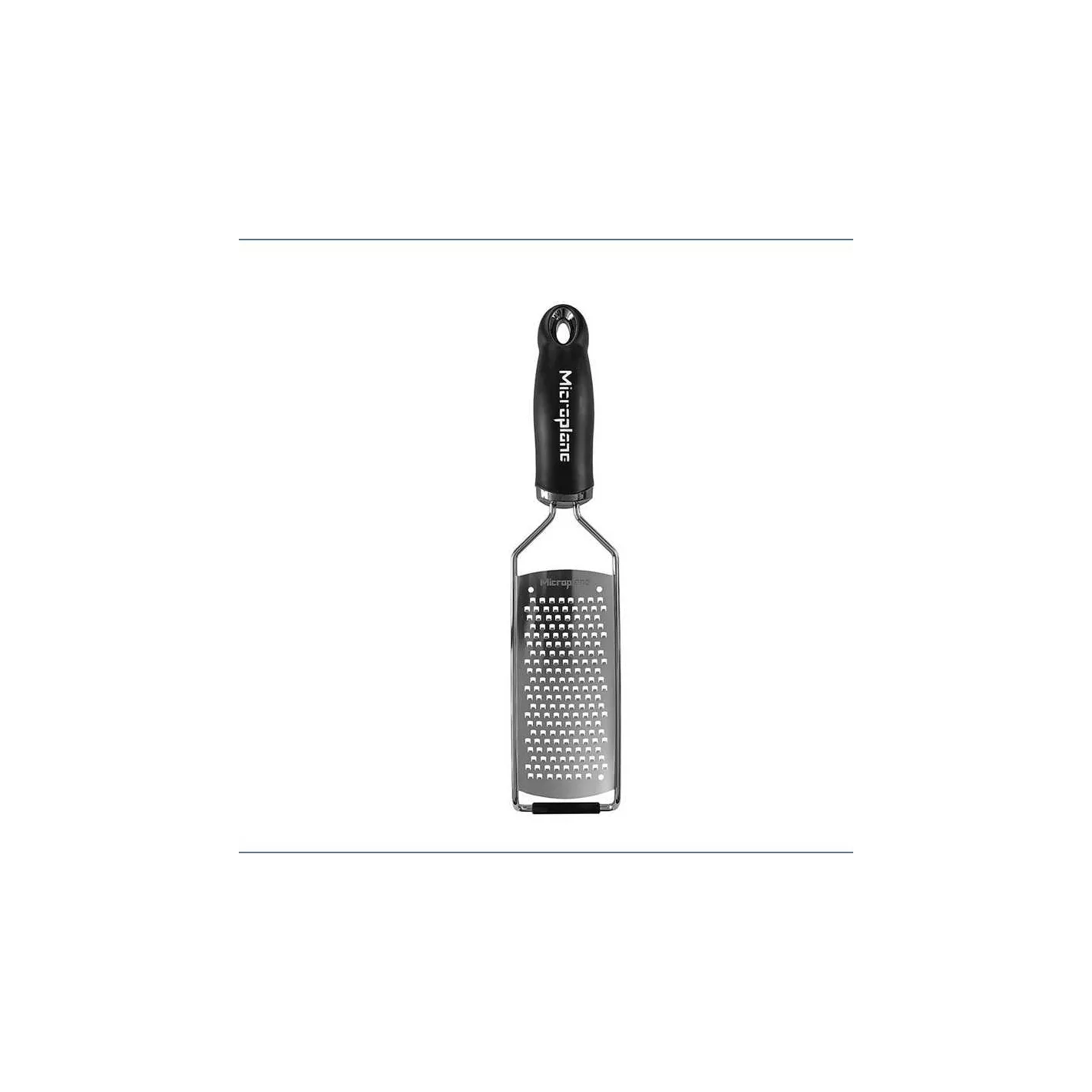El rallador grueso Microplane Gourmet Series cuenta con un mango cómodo y ergonómico de tacto suave con bucle para colgar opcionalmente, una base antideslizante para mayor estabilidad, y una cubierta reutilizable para un almacenamiento seguro.