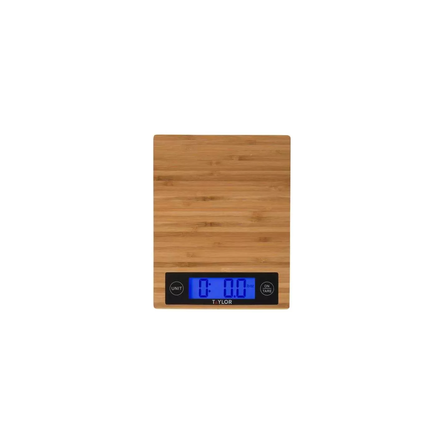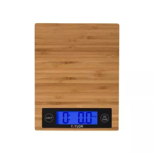 Esta atractiva báscula presenta una superficie de bambú duradera y ecológica con un acabado dorado. La báscula de bambú se destaca por una pantalla súper grande de 1.0 pulgadas con una luz de fondo azul brillante. Los botones táctiles ayudan a mantener la superficie fácil de limpiar. El perfil tiene solo 0.75 pulgadas de espesor pero tendrá una precisión de hasta 11 libras / 5 kilogramos en 0.1 onzas / incrementos de 1 gramo. También puede pesar líquidos, hasta 176 fl onza / 5000 mililitros. Una función de tara para agregar y pesar ayuda a poner a cero los tazones o los ingredientes adicionales. Además, la función de apagado automático ayuda a ahorrar batería.