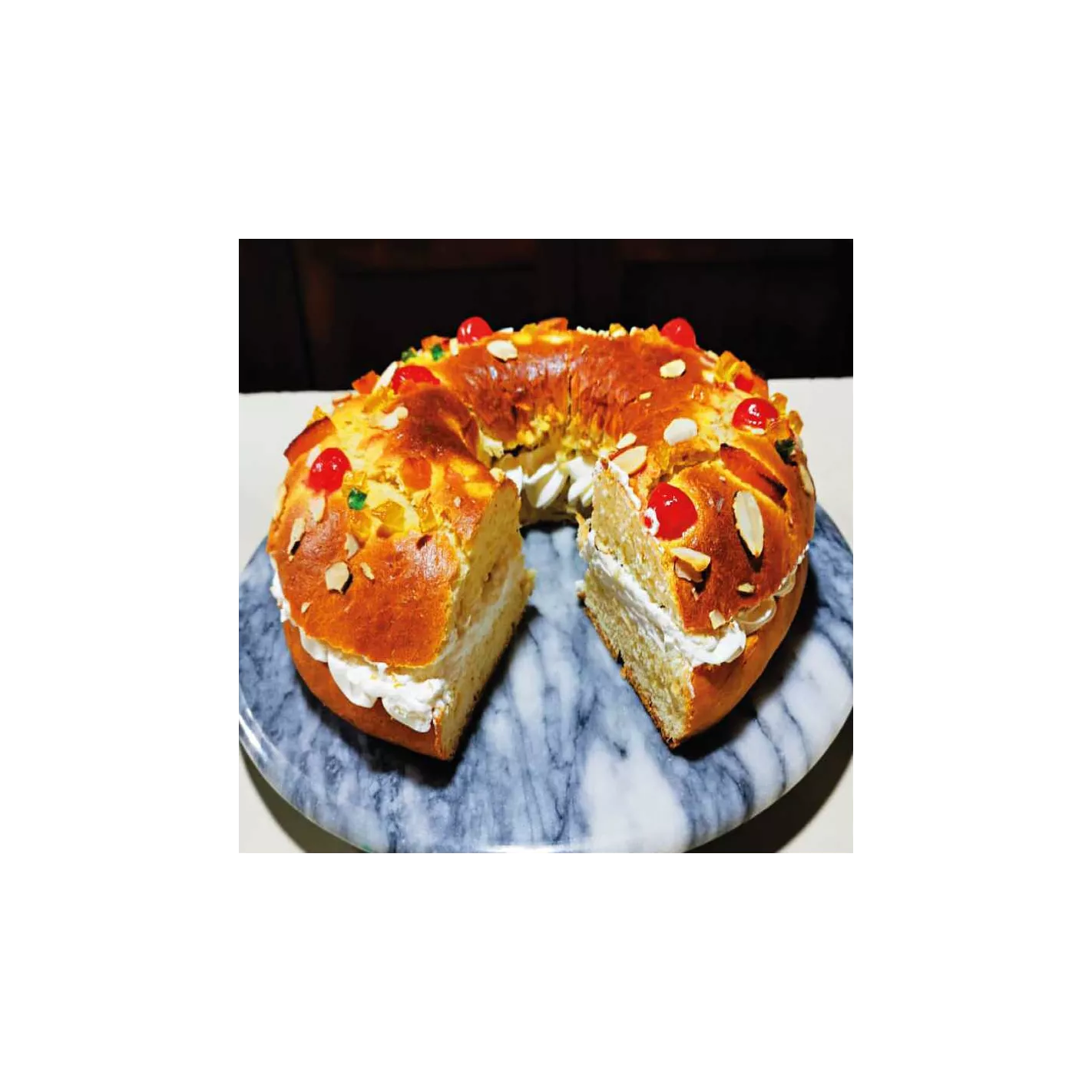 4-Pasar a la mesa de trabajo sacar el aire dividir en dos para formar la rosca y coloque sobre una bandeja engrasada y deje nuevamente duplicar su tamaño barnizar con huevo batido las frutas, almendras laminadas la costra si lo desean.
