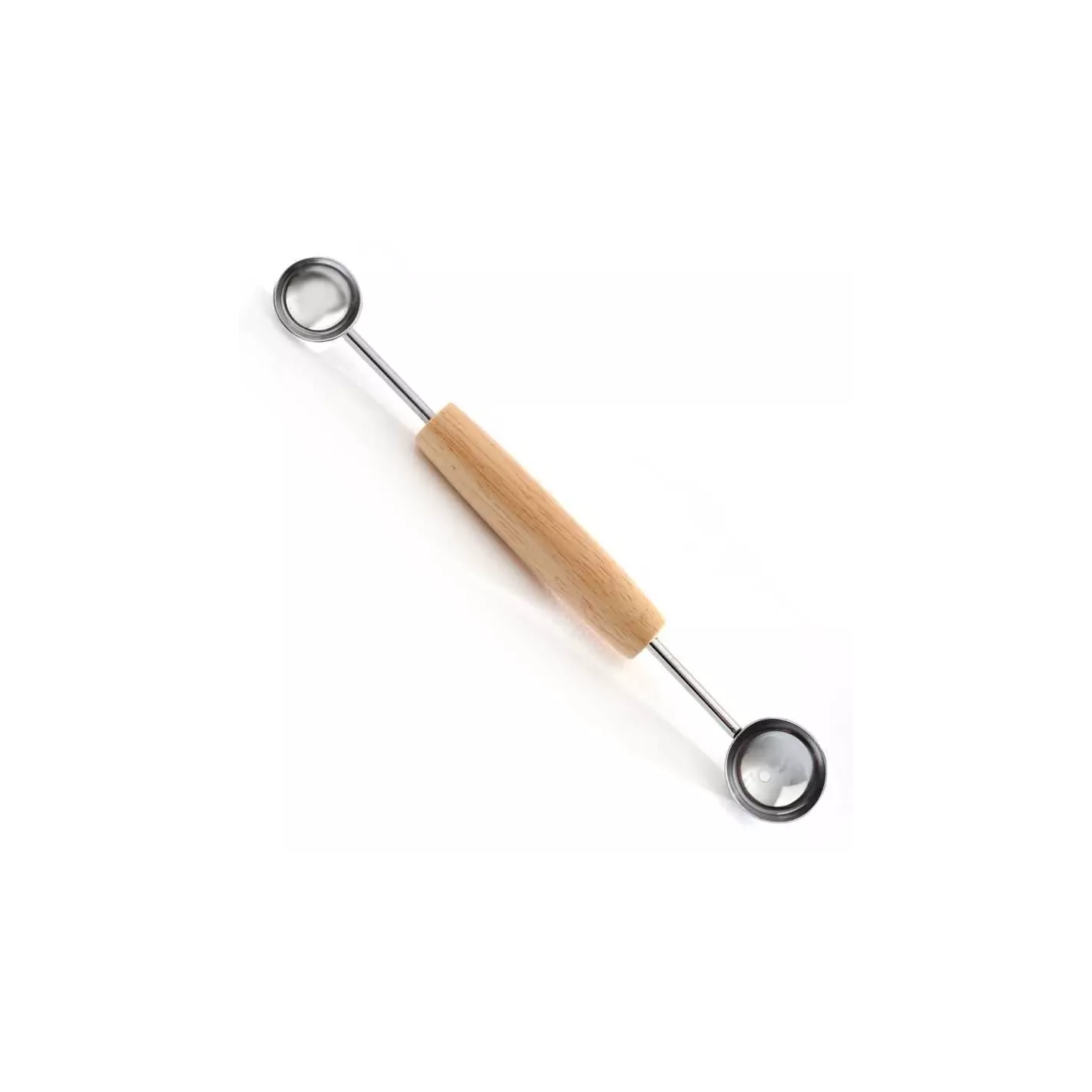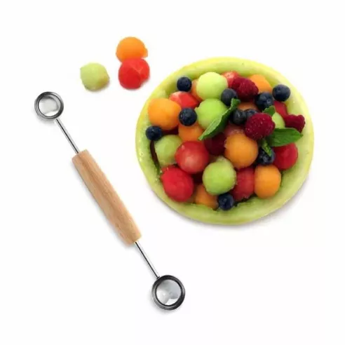 Saque fácilmente bolas decorativas de melón, mantequilla, peras, manzanas, papas, queso y helado. Esta sacabocados doble tiene dos cucharadas de diferentes tamaños (1 pulgada y 1-1/4 pulgada de diámetro). Tallar frutas casi no requiere tiempo ni esfuerzo. Ideal para sacar tomates cherry, quitar semillas de pepinos o sacar el núcleo de una manzana o pera y raspar las cuerdas del interior de la calabaza. Perfecto para ensaladas de frutas, guarniciones y bocadillos de frutas saludables. Cómodo mango de madera. Lavar a mano para obtener mejores resultados.