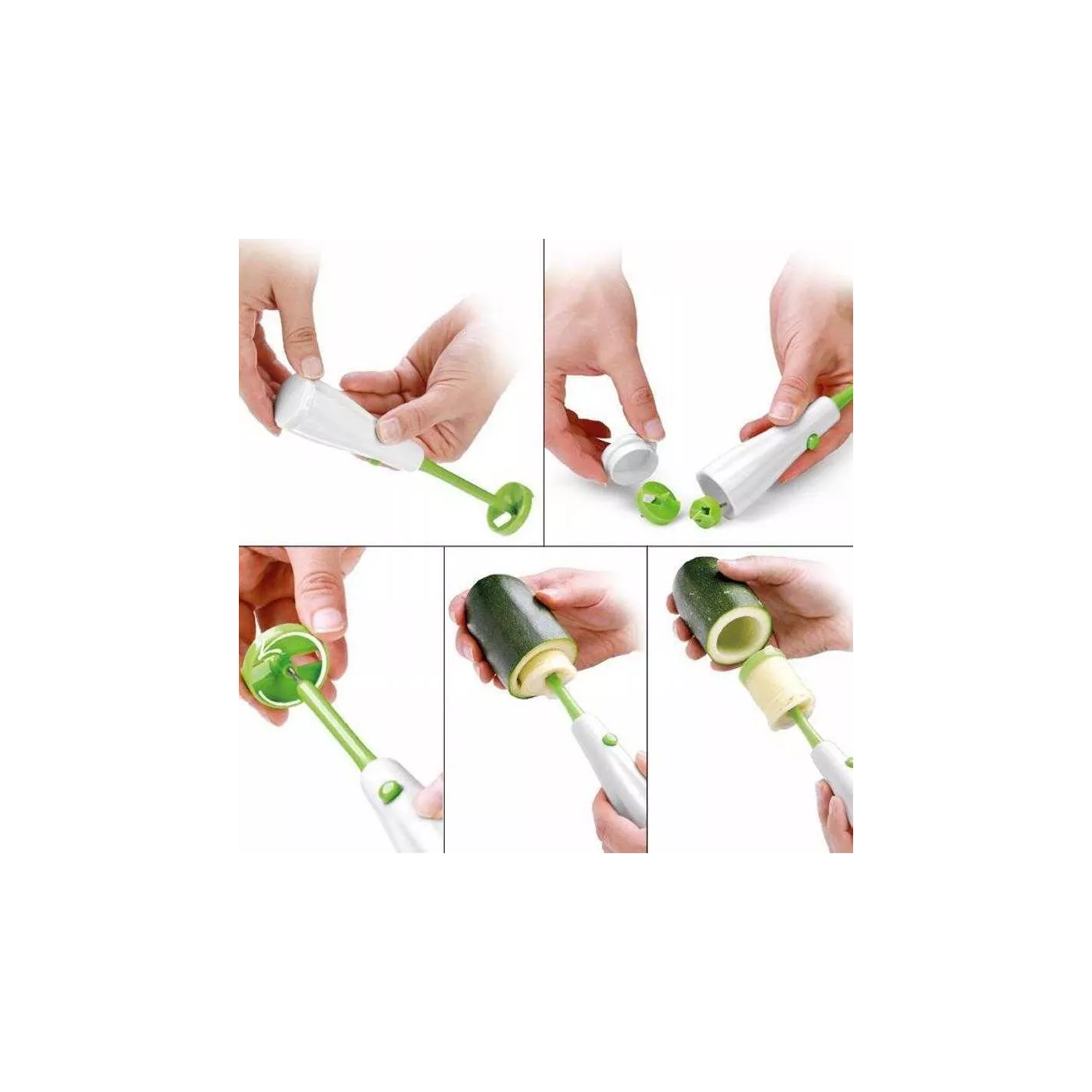 Excelente para hacer núcleos y preparar calabacines rellenos, patatas, pepinos, tomates duros, tubérculos, manzanas en una manta, etc. Con 3 tamaños de cuchillas de corte. Perfectamente ahorra espacio. Las hojas que no se utilicen se pueden guardar dentro del mango. Fabricada en plástico resistente. Limpiar con agua corriente. Dimensiones: largo 21.5 centímetros.