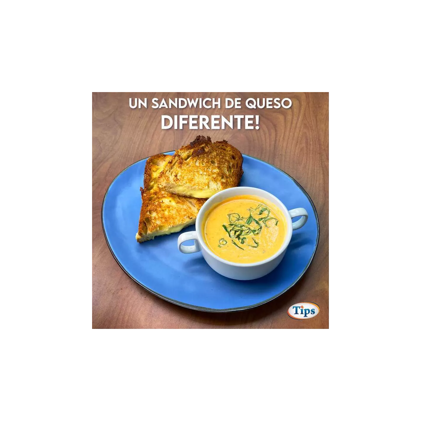 1-Colocar un poco de mantequilla en una sartén y dejar derretir, hacer un sandwich con el pan y el queso y poner a dorar, dar vuelta y agregar un poco más de mantequilla y dejar dorar. Servir con la crema de tomate.