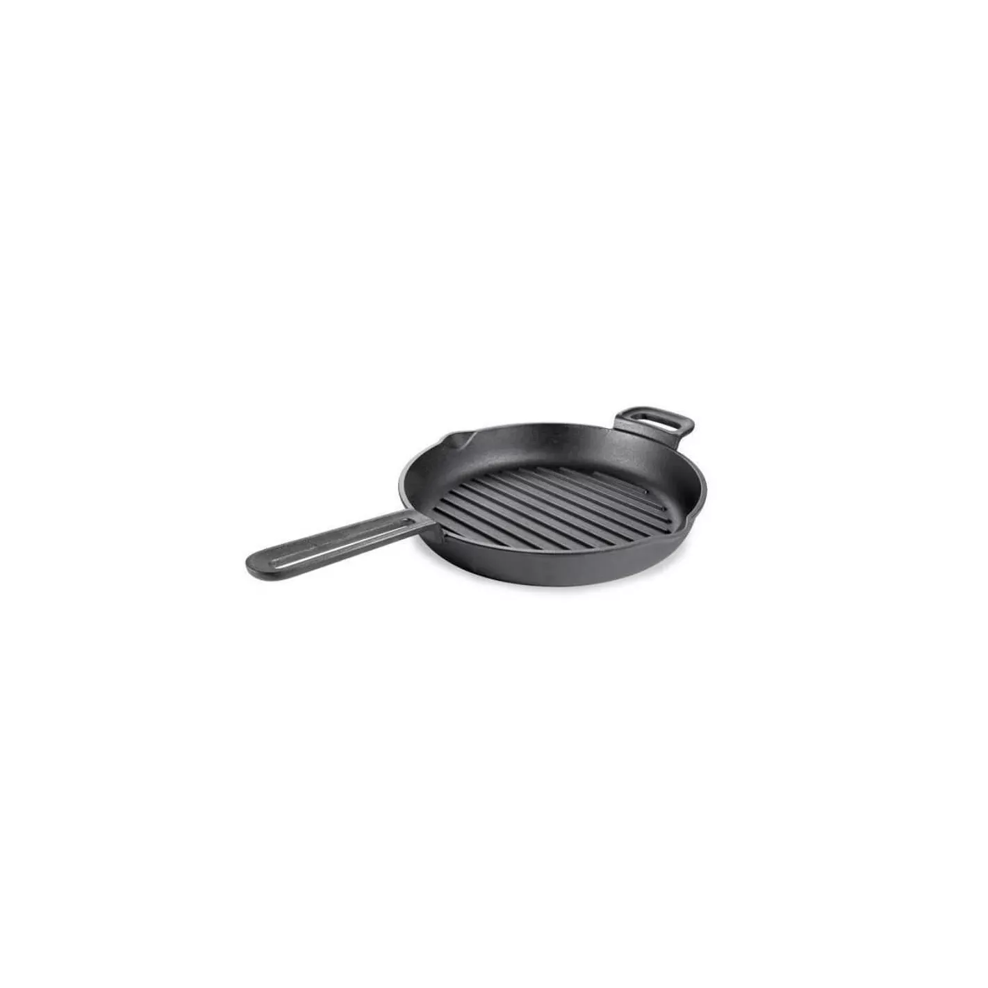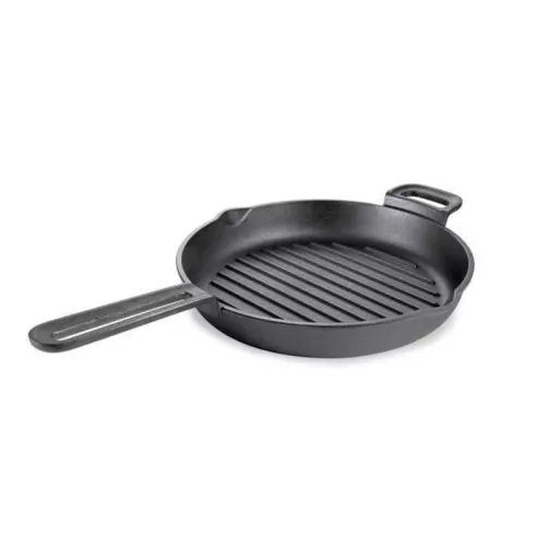 Sartén de hierro fundido macizo con propiedades de acumulación térmica mejoradas excelente para asar carnes, pescados y verduras en cocinas de gas, en parrillas y en horno. Cuando se forma una capa protectora antiadherente en la superficie (condimento), las propiedades de primera clase de los resistentes utensilios de cocina de hierro fundido mejoran con cada uso. Ideal para usar en Power gril.