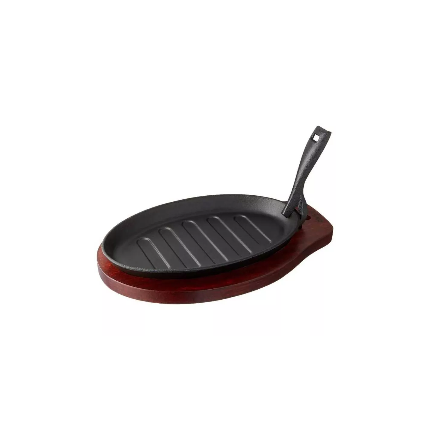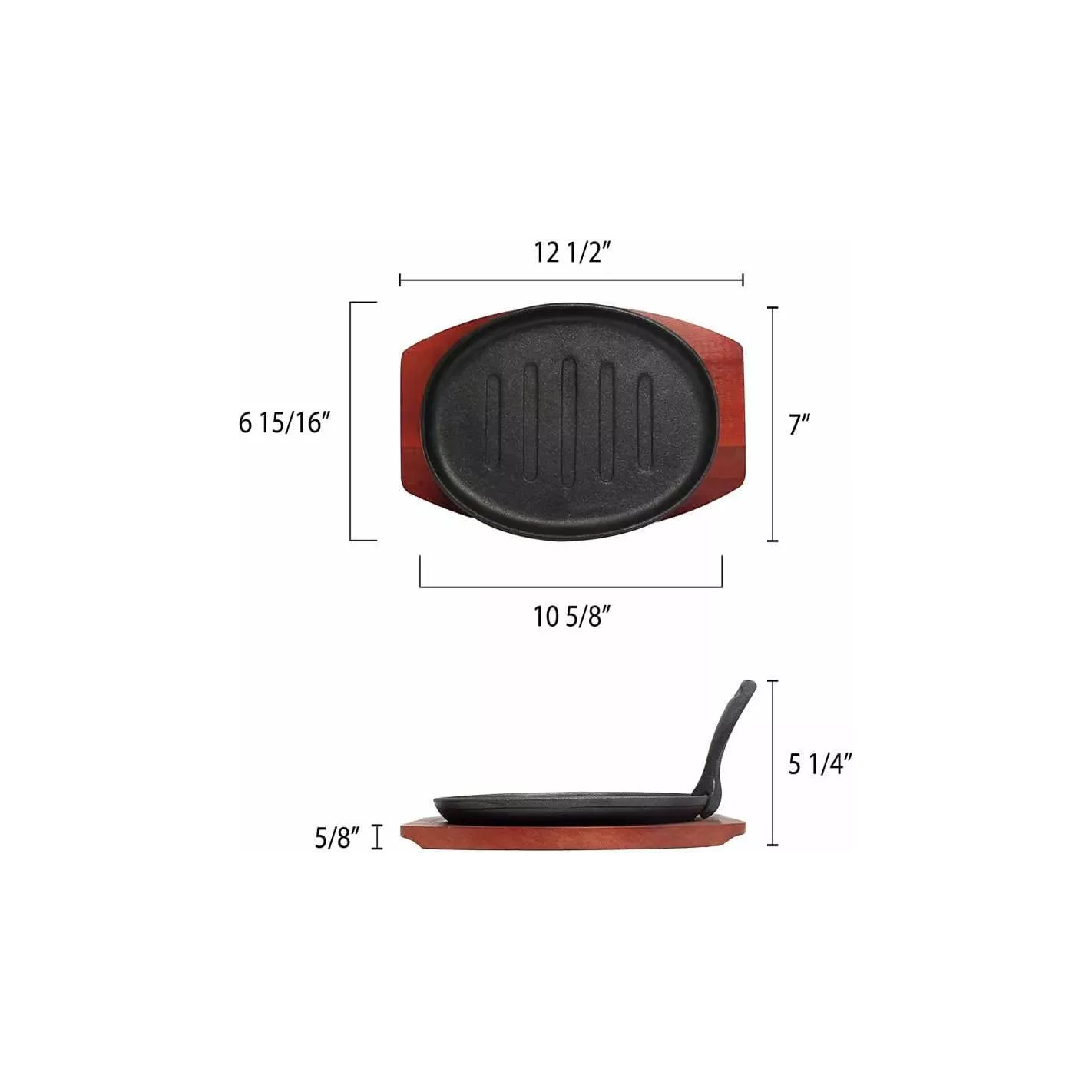 Sostenga y sirva con seguridad las carnes y verduras a la parrilla en el sartén ovalado Thunder Group IRBB001 con Underliner y Gripper. Combinando funcionalidad y durabilidad, cada pieza de este conjunto está hecha de materiales de alta calidad que resistirán una amplia gama de temperaturas sin romperse. Este juego de platos de 3 piezas viene con una plancha de hierro fundido duradera para una retención óptima del calor y un atractivo forro de madera para servir con seguridad. Gracias a su robusta pinza, su personal puede proporcionar de manera fácil y eficiente servicio de mesa caliente a sus clientes.