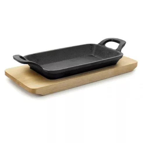 Sartén y asa de hierro fundido con base de madera. Perfecto para cocinar carnes, mariscos, verduras y mucho más. Ayuda a mantener la comida caliente, mientras que la tabla de madera de arce mantiene tu mesa protegida.USO: COMERCIAL
