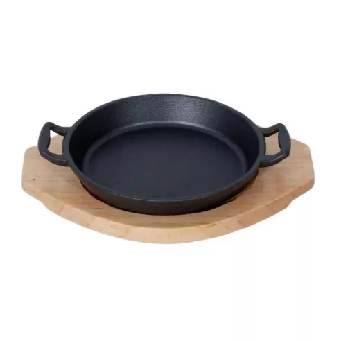 Sartén y asa de hierro fundido con base de madera. Perfecto para cocinar carnes, mariscos, verduras y mucho más. Ayuda a mantener la comida caliente, mientras que la tabla de madera mantiene tu mesa protegida